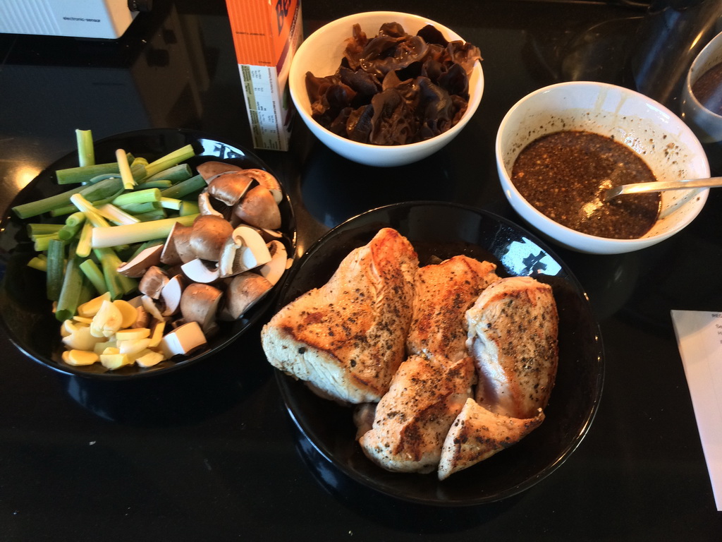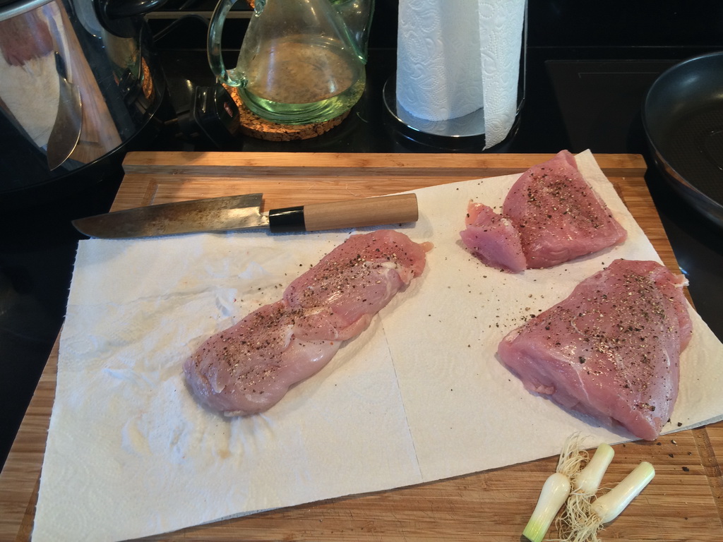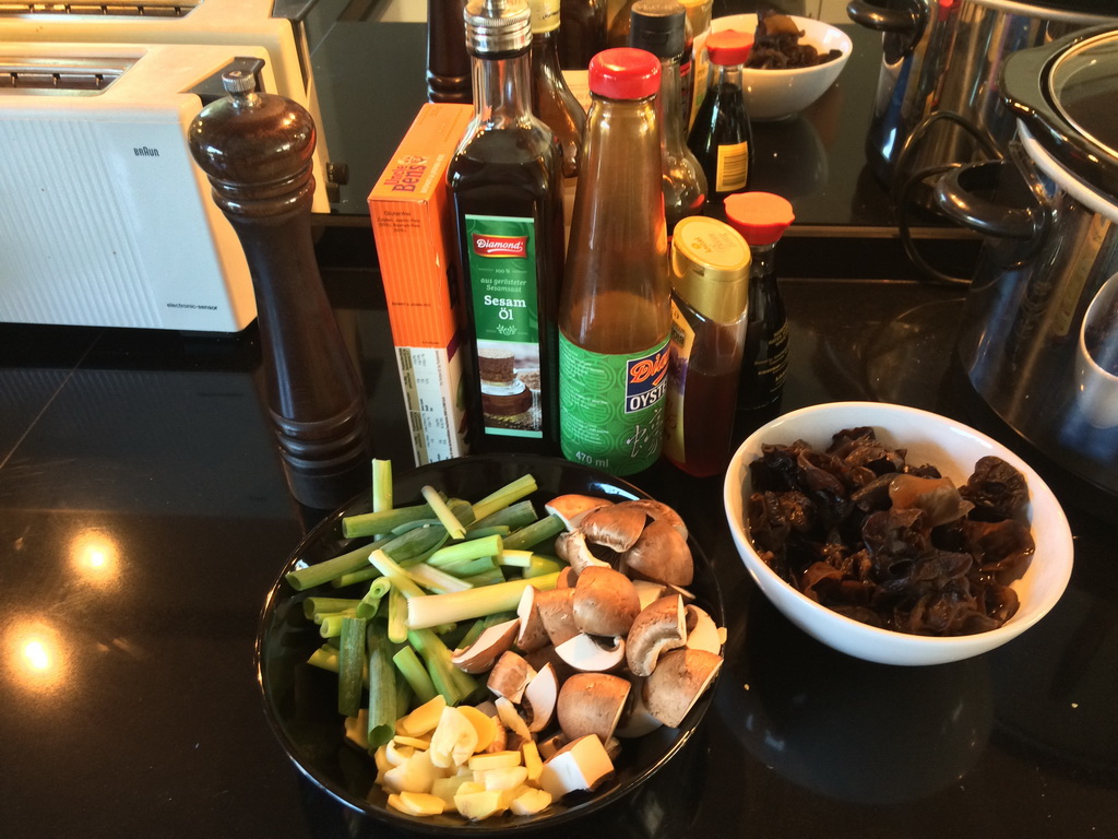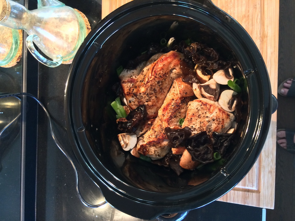 (What a title…) A new try with the slow cooker. Teriyaki-style honey and sesame turkey breast with mushrooms and spring onions for three persons. Since it turned out delicious, as I promised here’s the recipe. I found it somwhere on the internet and (strongly) adapted it to my needs.