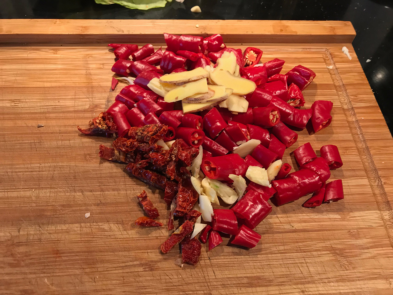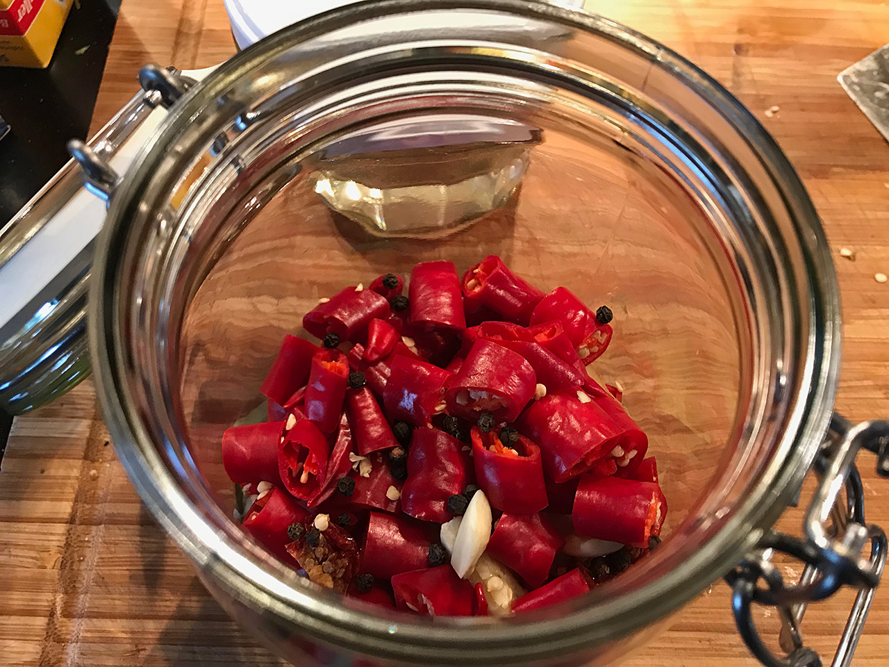 Wash the chilies and cut them into 1/2 inch pices. For a lighter version, remove the seeds, for a stronger version leave them in. Peel and slice the ginger and crush the garlic. Add the chilies, garlic, ginger and tomatoes to a glass jar.