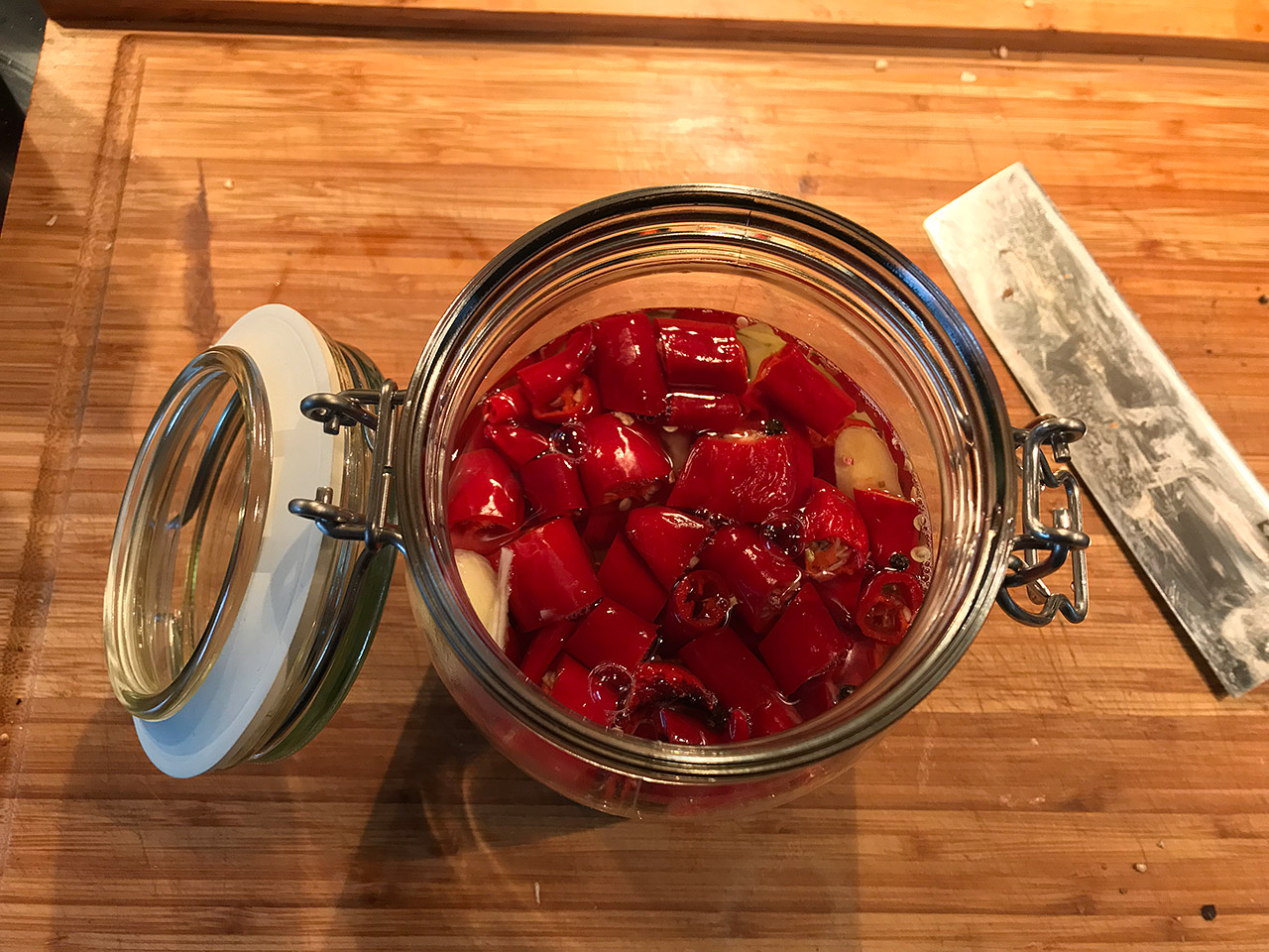 Make a brine from water, salt and vinegar and fill your jar until all chillies are coverd. Two ways to proceed now: a.) Simply close your jar, or b.) use a drop lid with a weight.