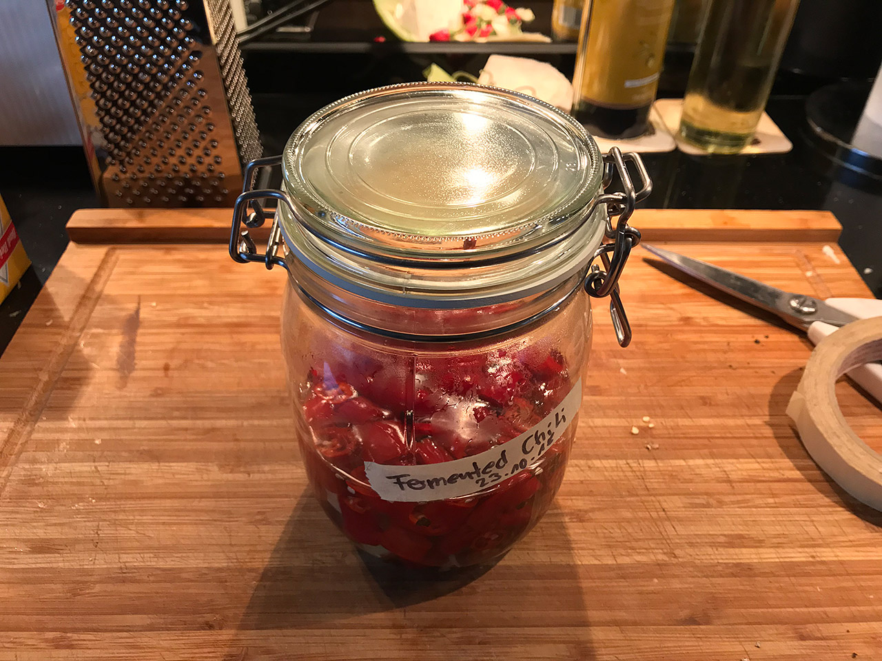Let ferment for 1-2 weeks. Strain the chilies reserving the brine and puree with a mixer. Then re-add brine to the desired consistency.
