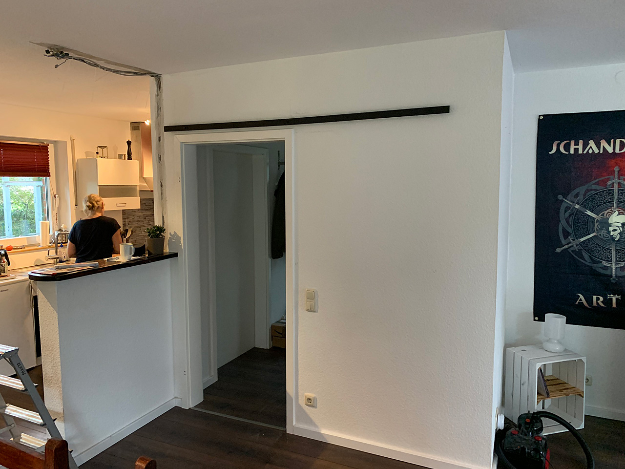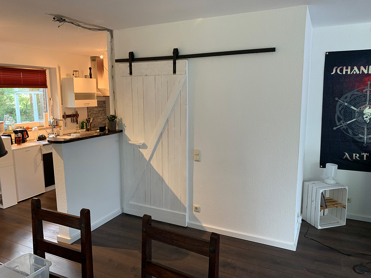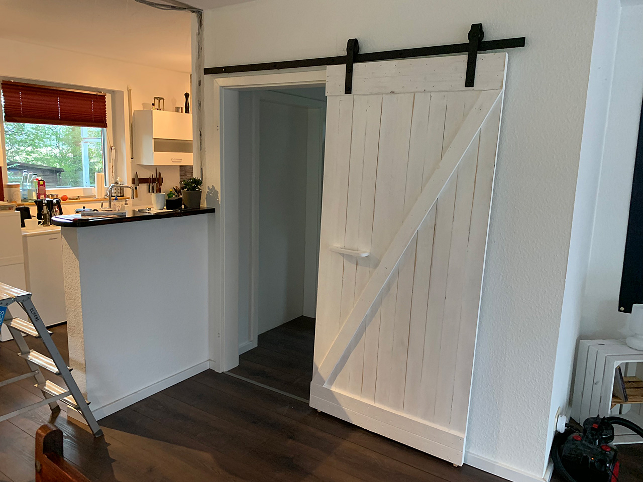 Lately, we removed a part of the wall separating the kitchen from the living room, creating a counter. Thus a normal living room door would always have stood in the way, so we decided to put in a sliding door instead. It’s “Barn-Door” style and, well, it is really barn-ish looking:
