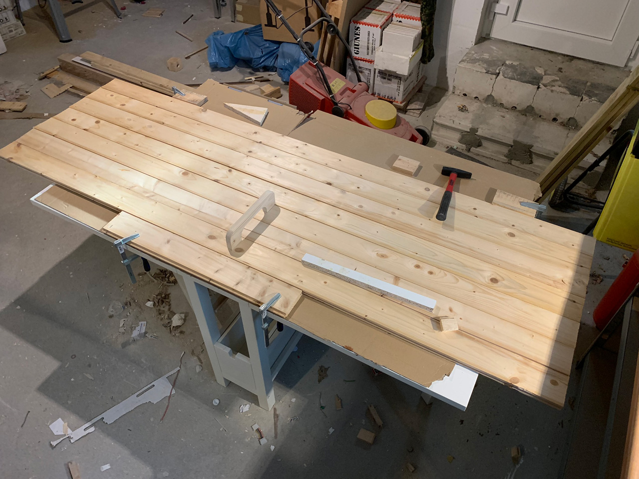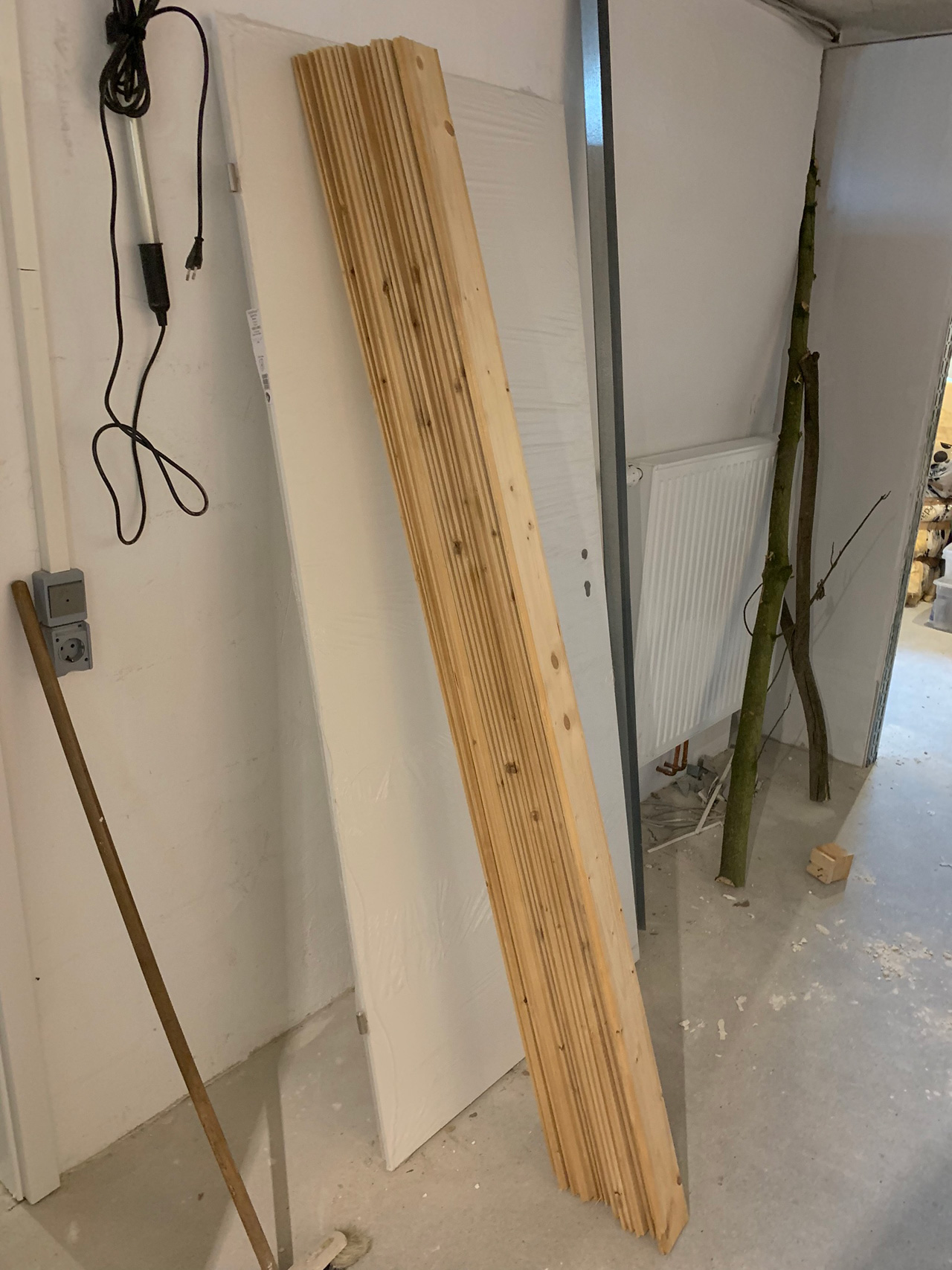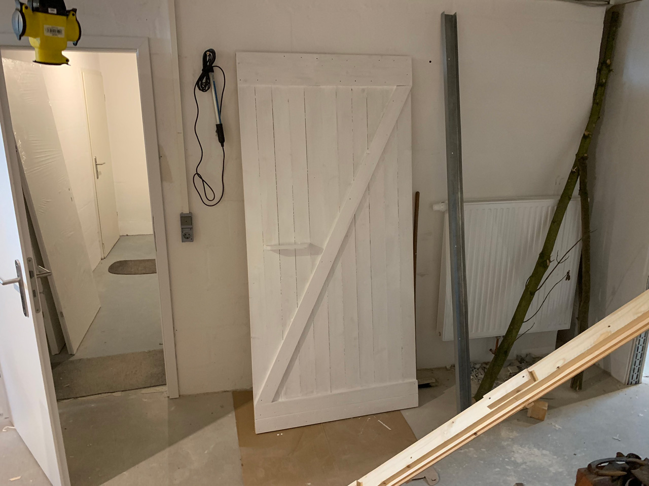 Lately, we removed a part of the wall separating the kitchen from the living room, creating a counter. Thus a normal living room door would always have stood in the way, so we decided to put in a sliding door instead. It’s “Barn-Door” style and, well, it is really barn-ish looking: