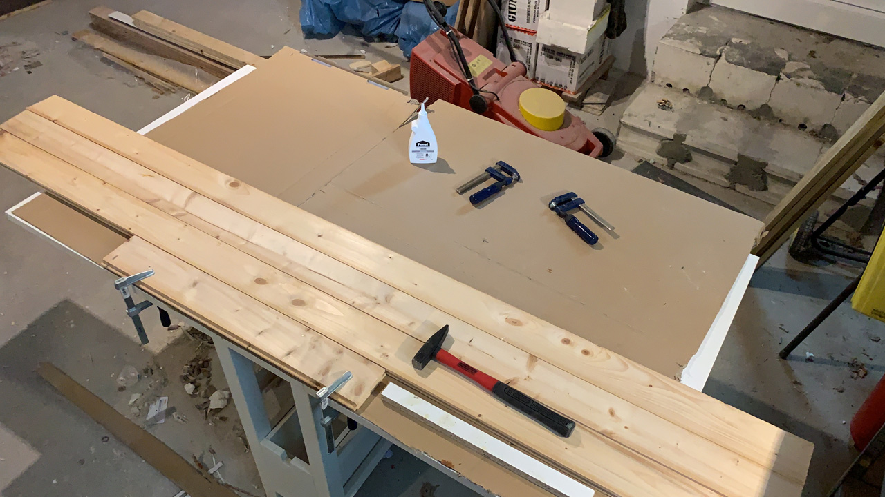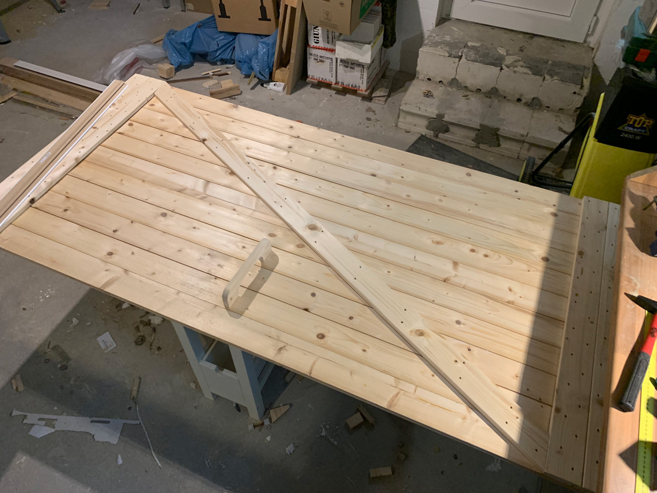 I built it from simple tongue and grove boards that the pre-owner of our house left behind, using a store-bought mounting system for the hardware.