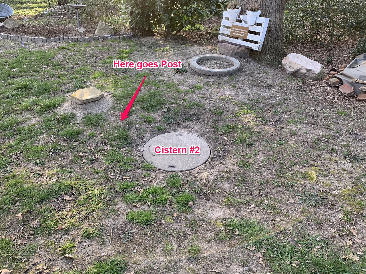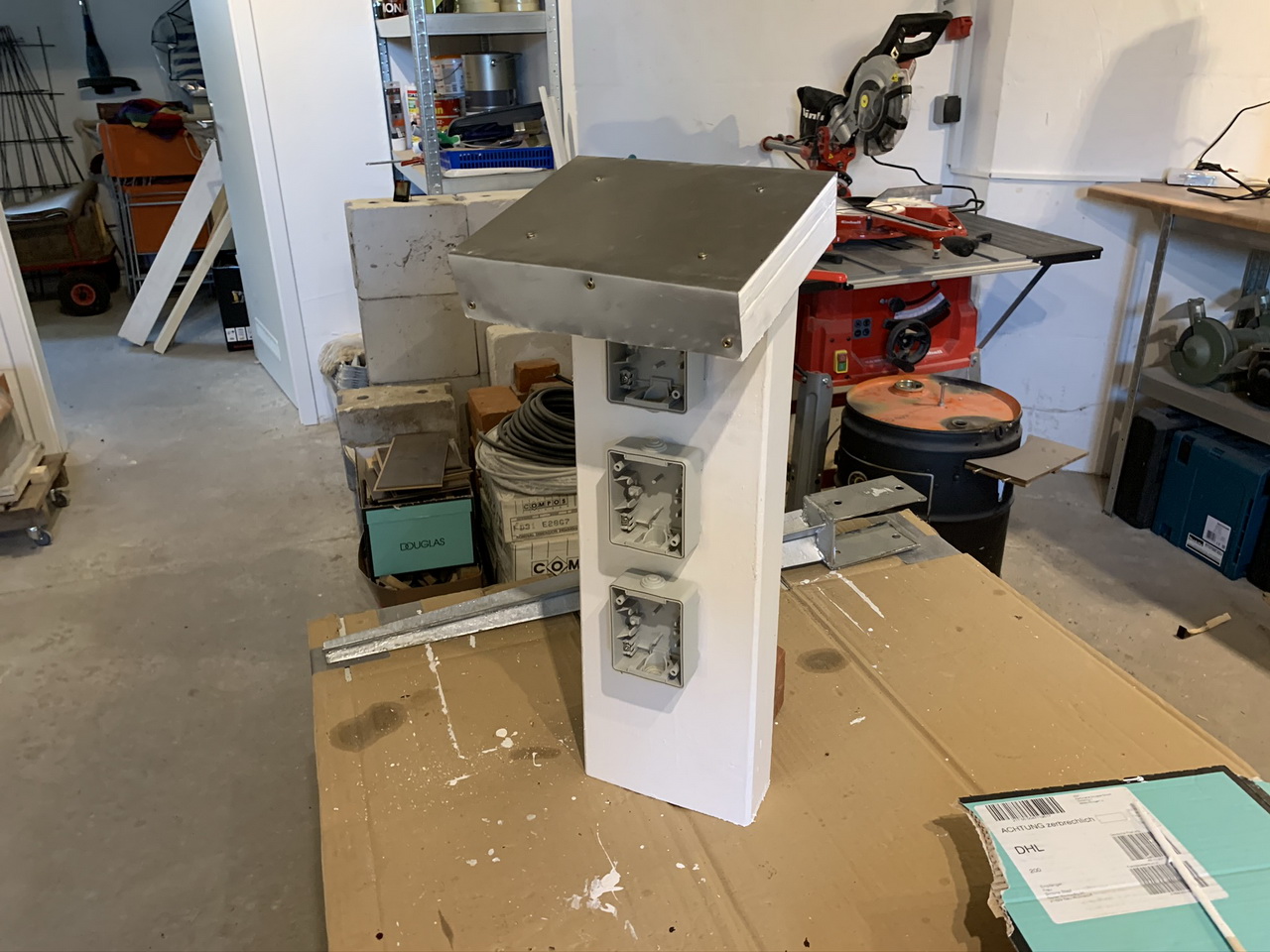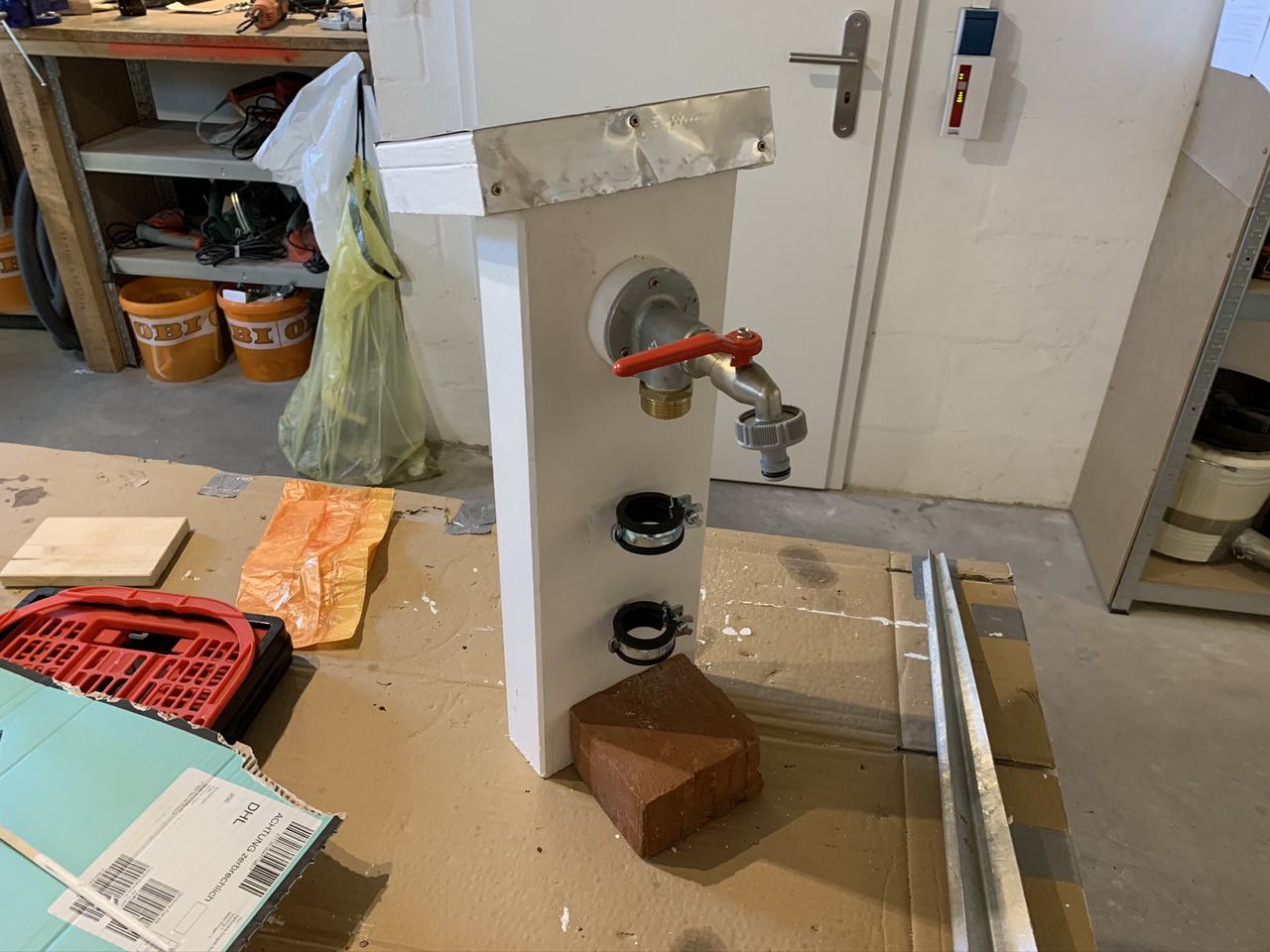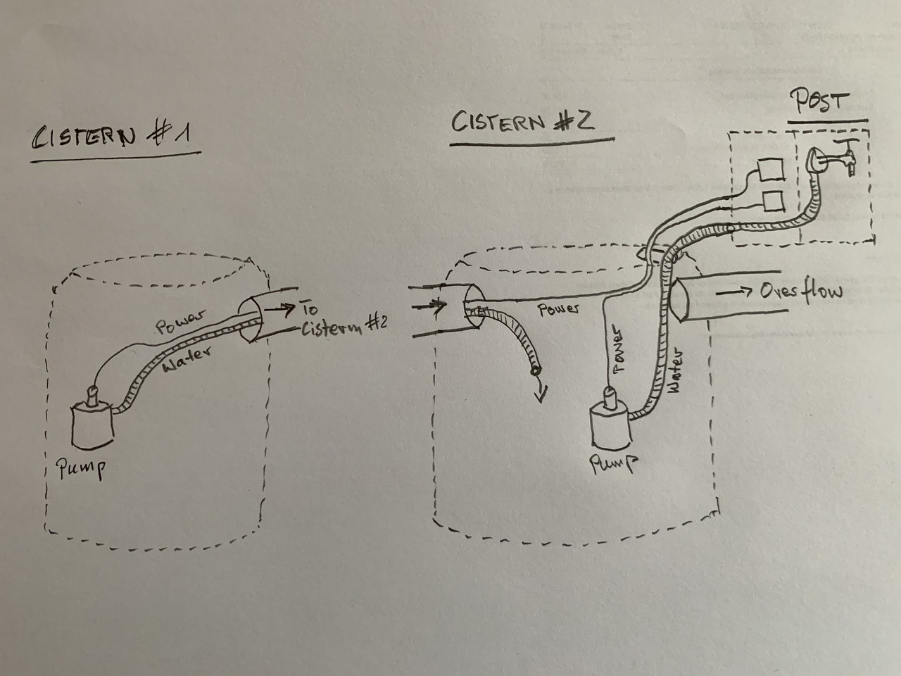 We have (involuntarily) found out how the outside rainwater draining works in the northern germany refuge. There is a drainage sump as well as a ring drainage around the house and two cisterns in the garden that serve as a reservoir and have an overflow pipe in case they’re filled to a certain level. These cisterns can of course be used for watering the garden using a submergible pump, as they’re filled with free rainwater. Here’s what I came up with as an idea to make use of this reservoir. It’s a post combining the electrical wiring of the two pumps and an outlet for watering: