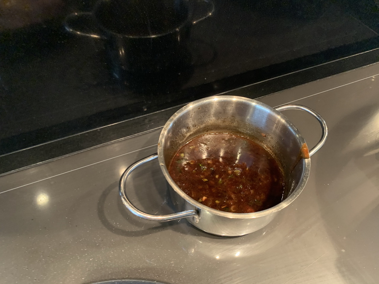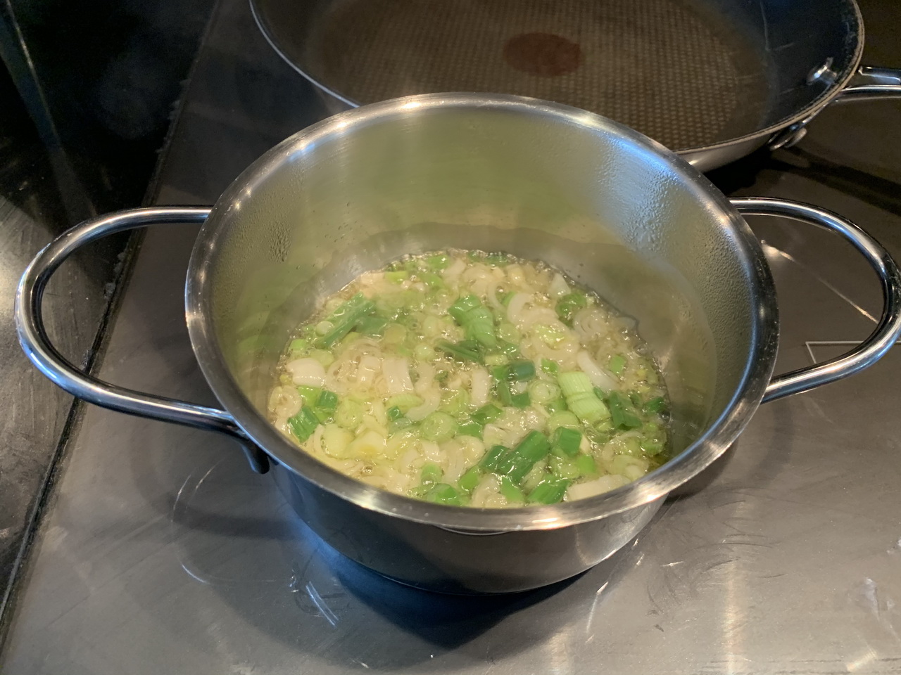 Chop the green onion and mince the garlic. In a pot over medium-high heat, add some cooking oil and then the onions and garlic. Let them become translucent, stirring often. Add the doubanjiang, stir and let it become fragrant. Then add the other sauce ingredients and bring to boil, stirring well. Set aside.