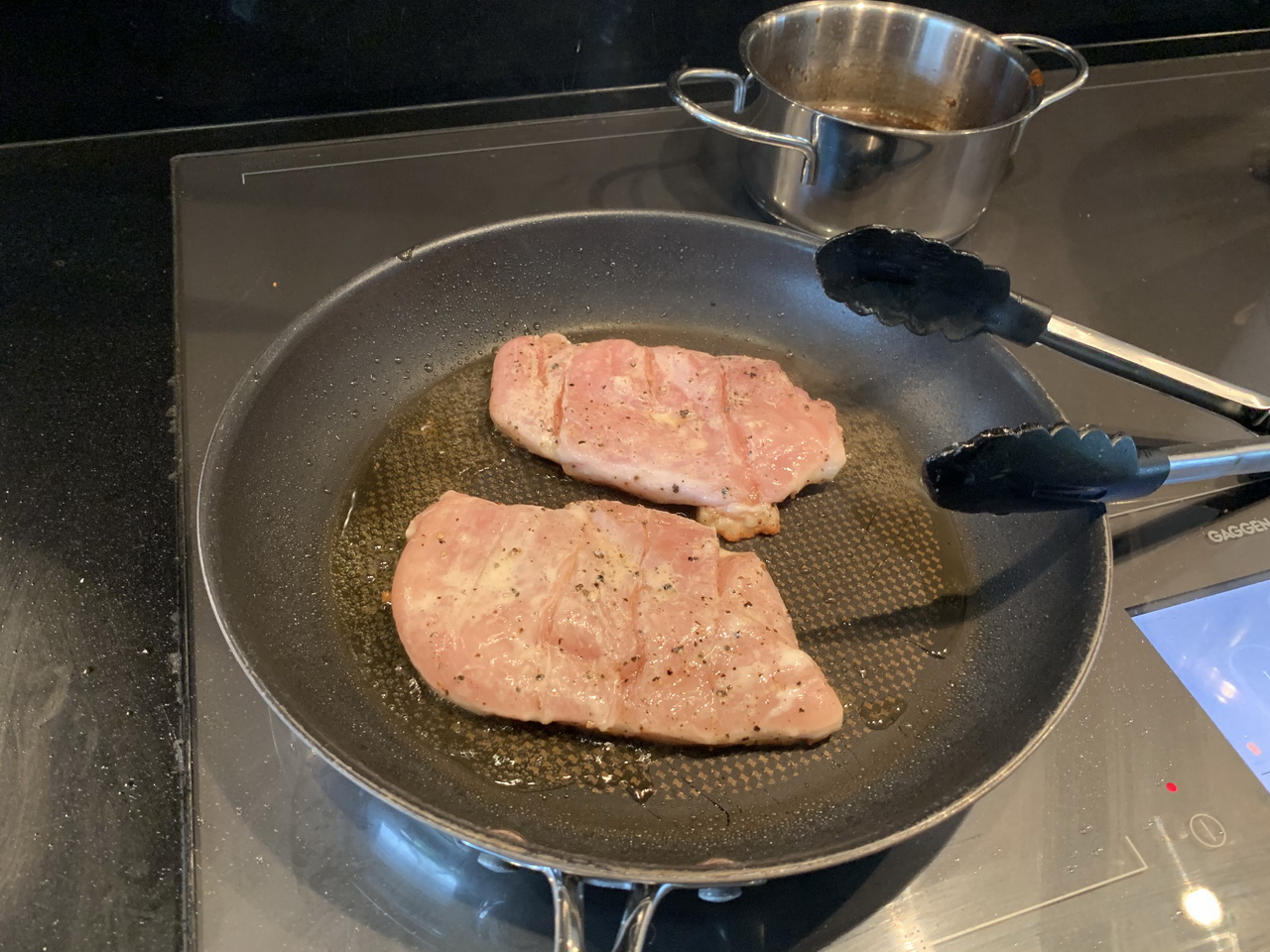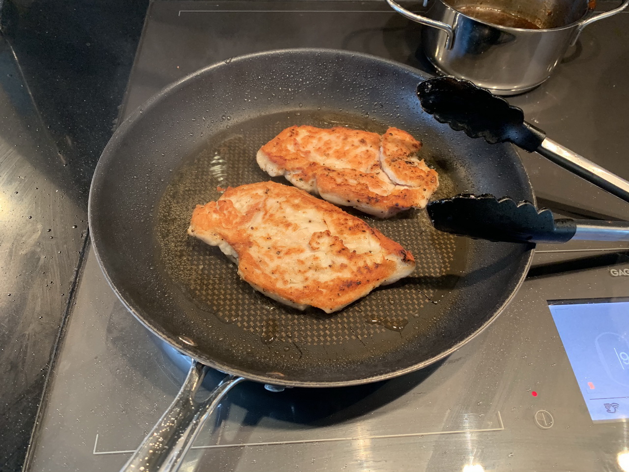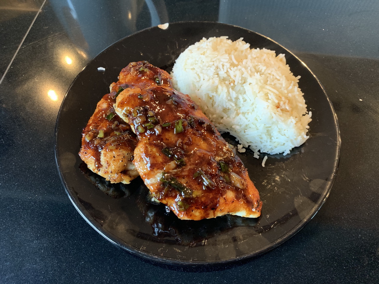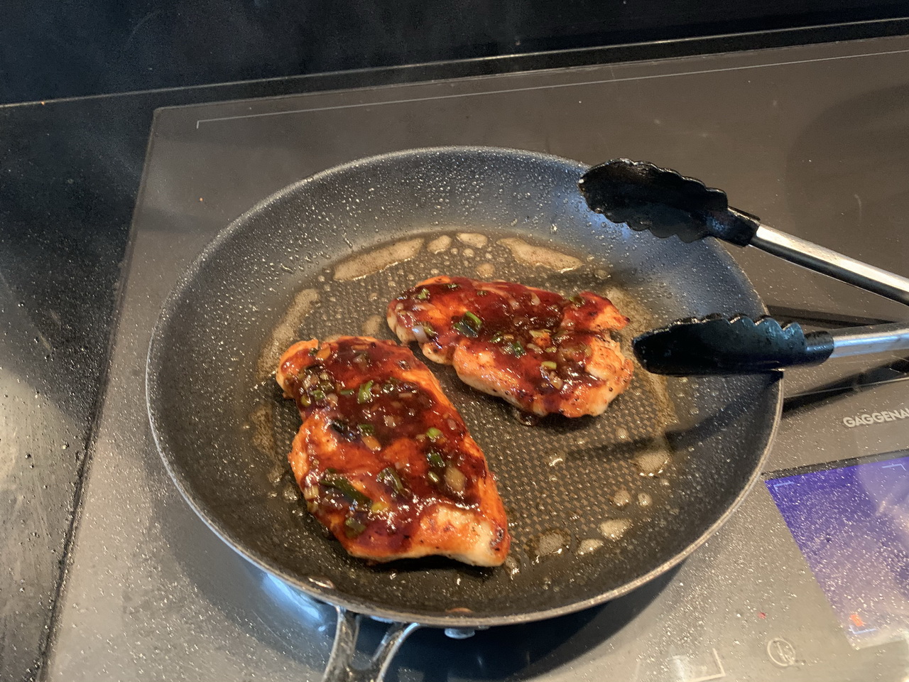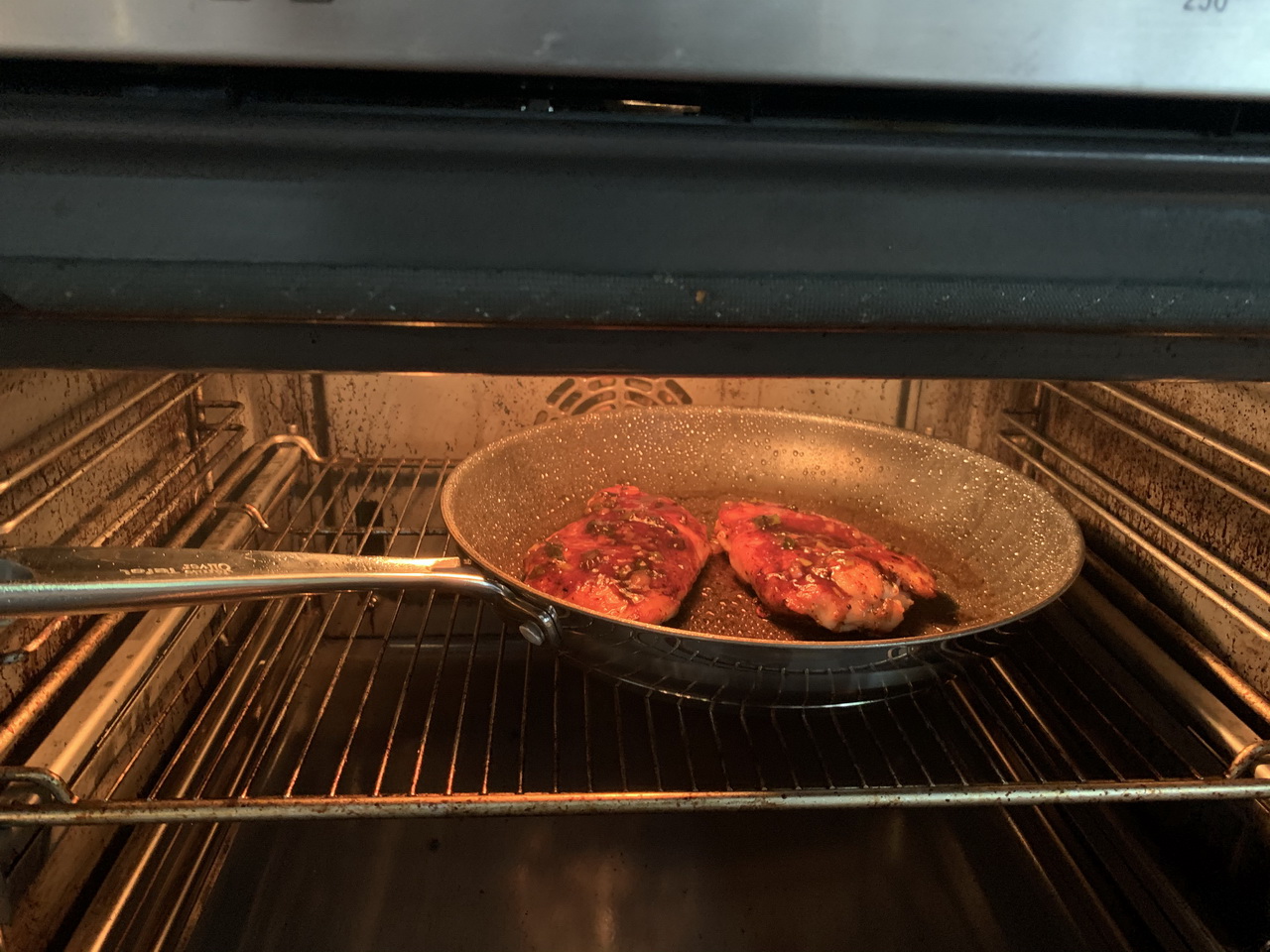 In an oven-safe pan over medium high to high heat, fry the chicken breats for 2-3 minutes each side until nicely browned and cooked about halfway through. Glaze them copiously with the sauce on one side and put into the oven for 6-7 minutes until the sauce caramelizes and the chicken is cooked through completely.