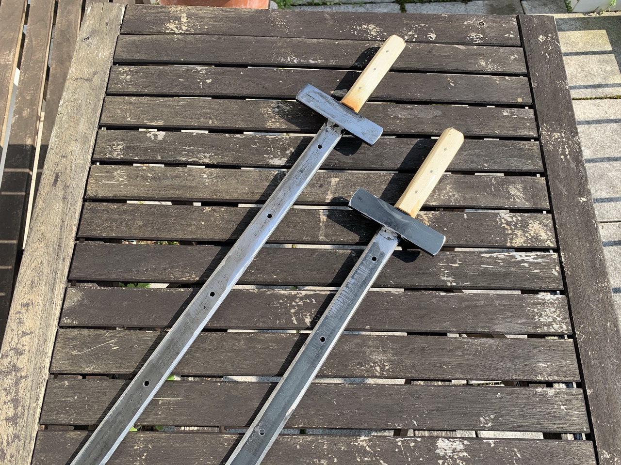 I found an interesting image of some churrasco spits on the internet and thought to myself: Yeah! Why not make them look like a sword? It’d be wide enough to hold any piece of meat firmly and prevent it from rotating on the spit, plus I can poke into the ground if necessary, and – plus plus – it would simply look cool.