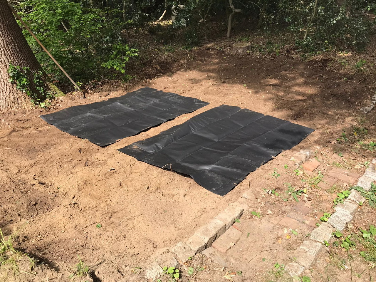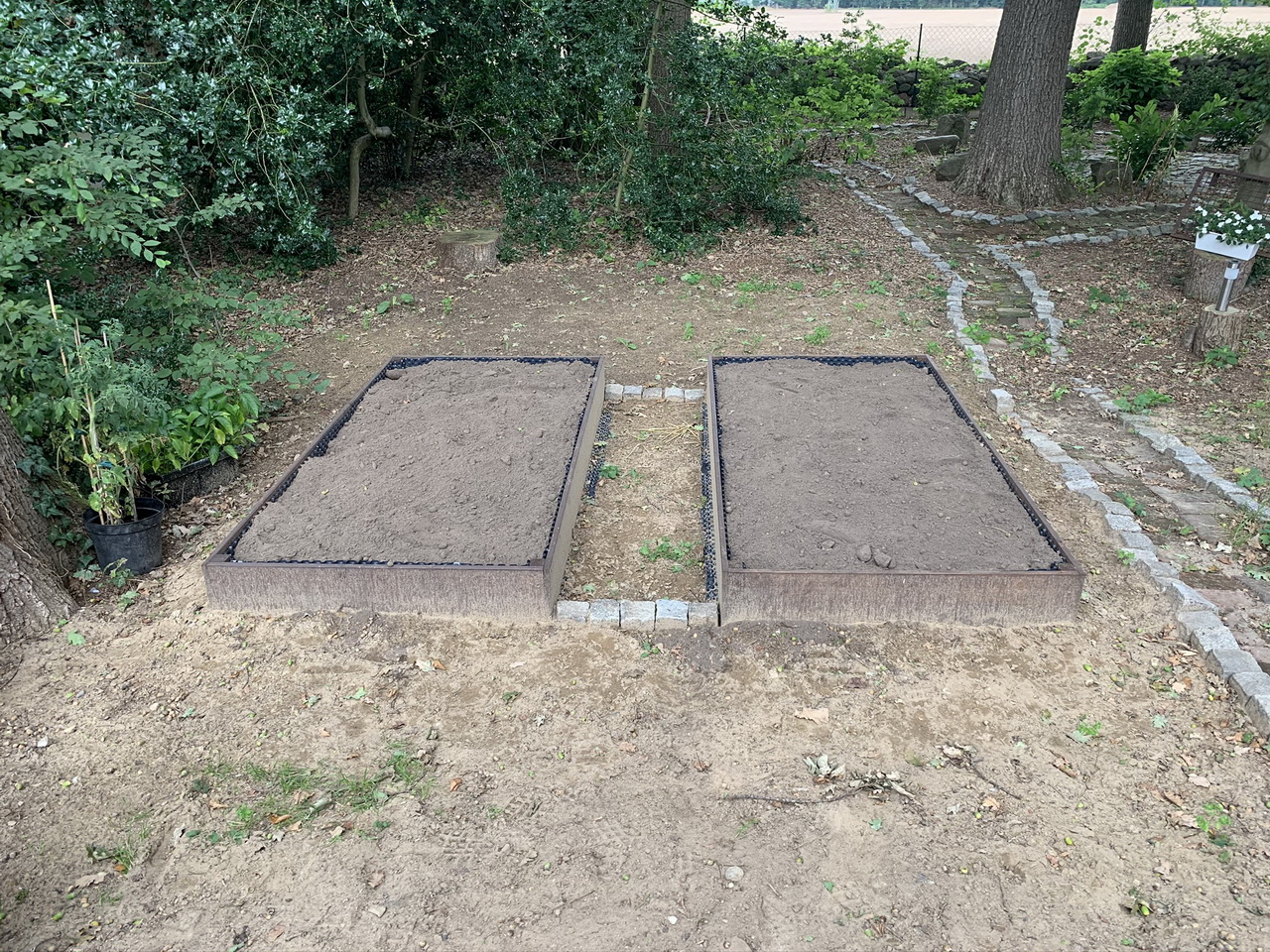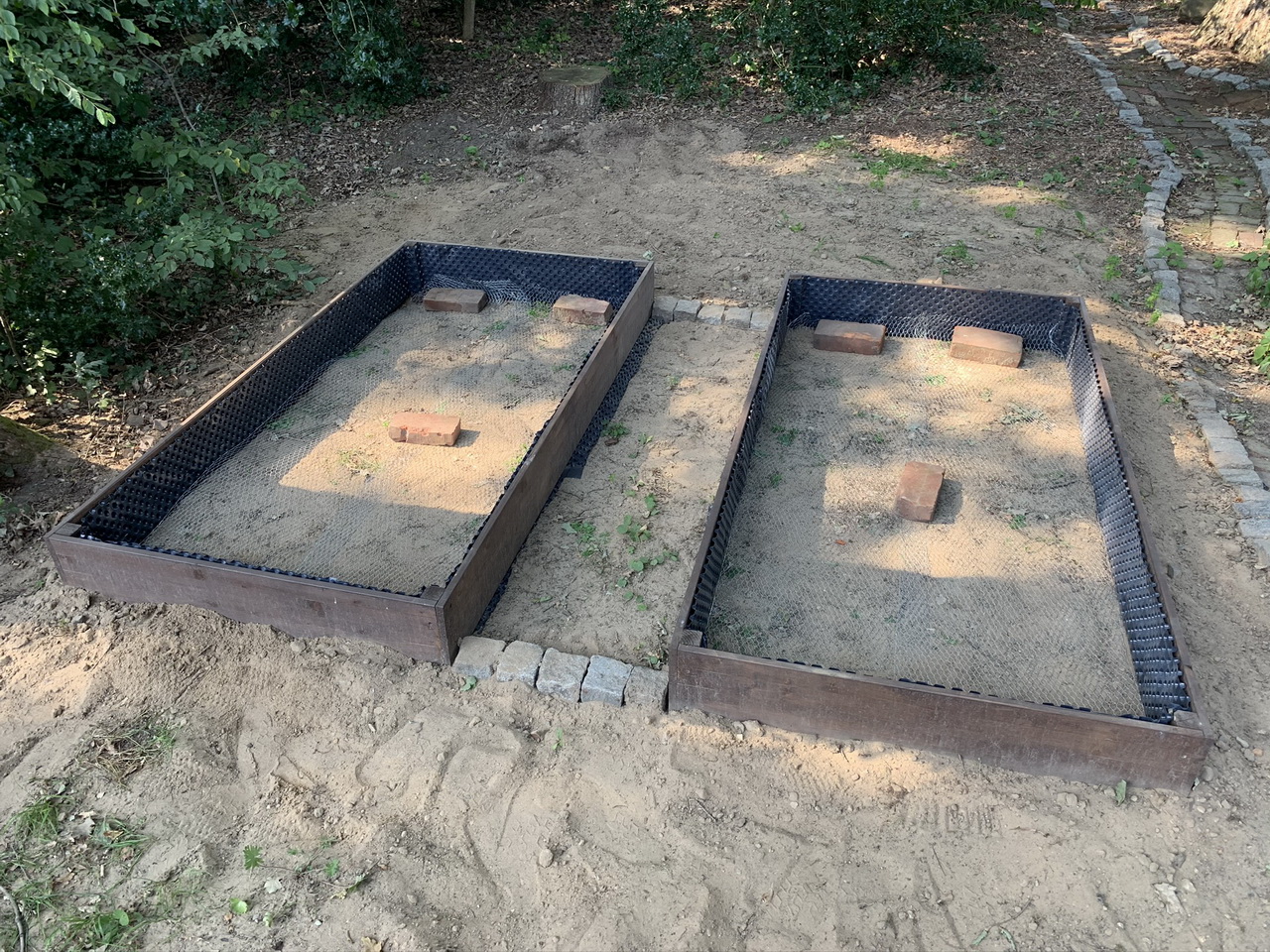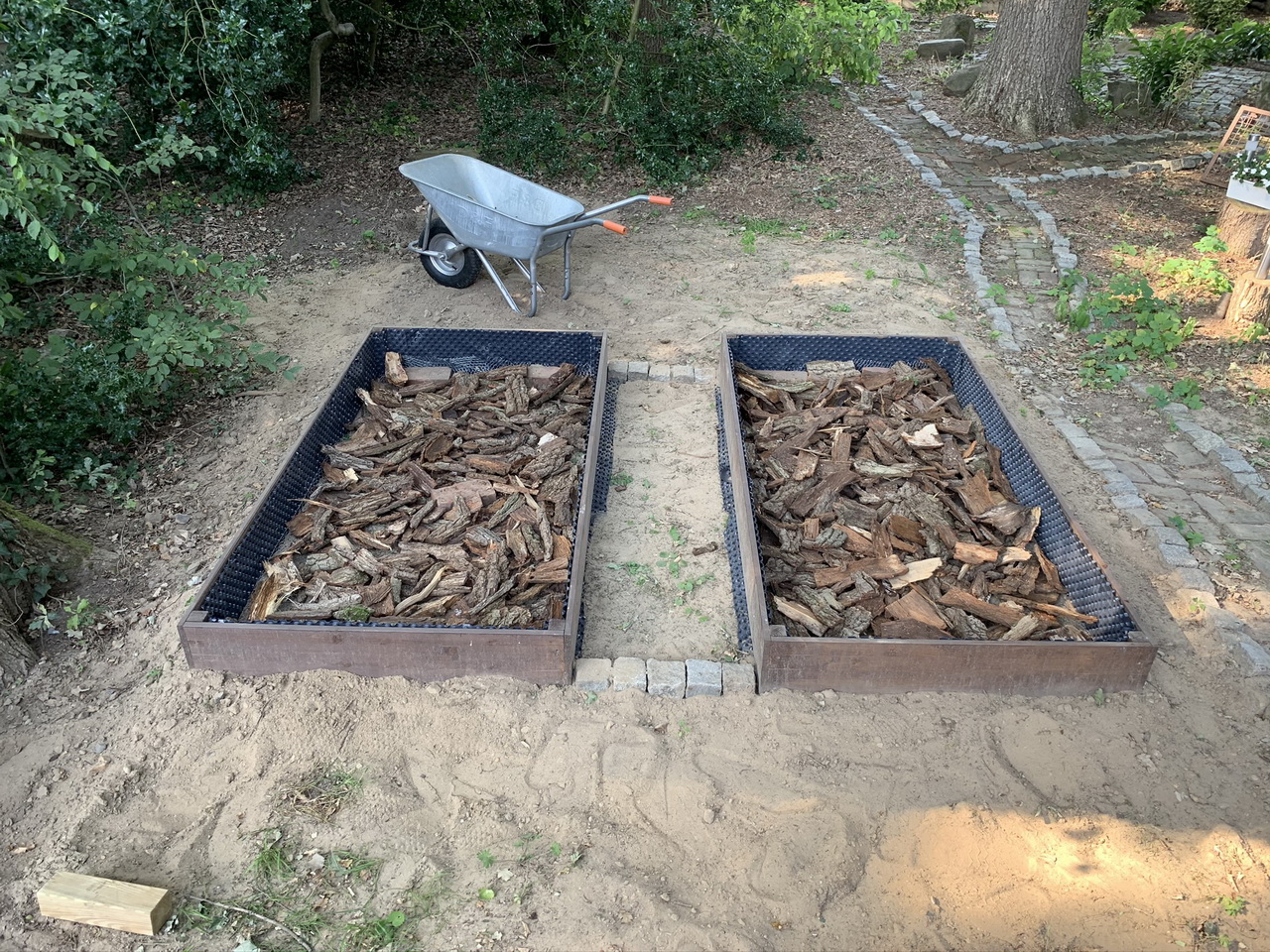 Below the ground I added some weed control fabric, covered with sand. The bottoms of the beds are each lined with chicken wire in order to hopefully give the voles and moles that roam the garden at least some trouble. Finally, they’re filled with a layer of tree bark followed by ordinary garden soil. And that’s about it.