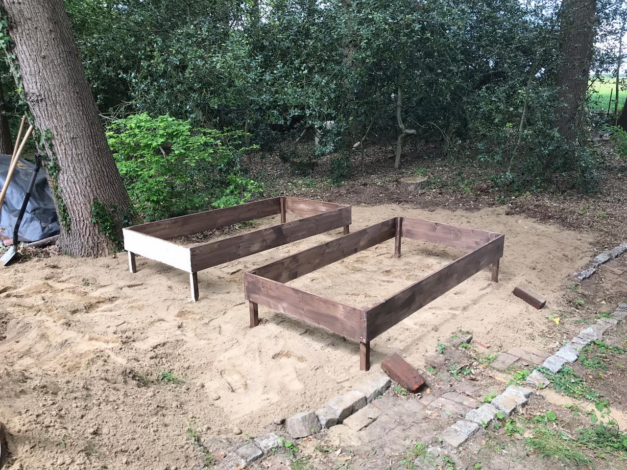 The measurements are 200 x 100 cm, with 30 cm in height. They’re made from simple hardware store wood, painted with two coats of wood preservative and lined with a waterproof dimpled sheeting for added moisture protection.
