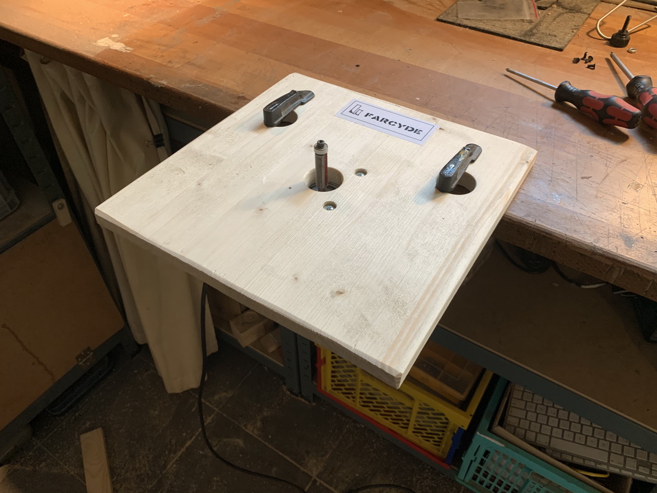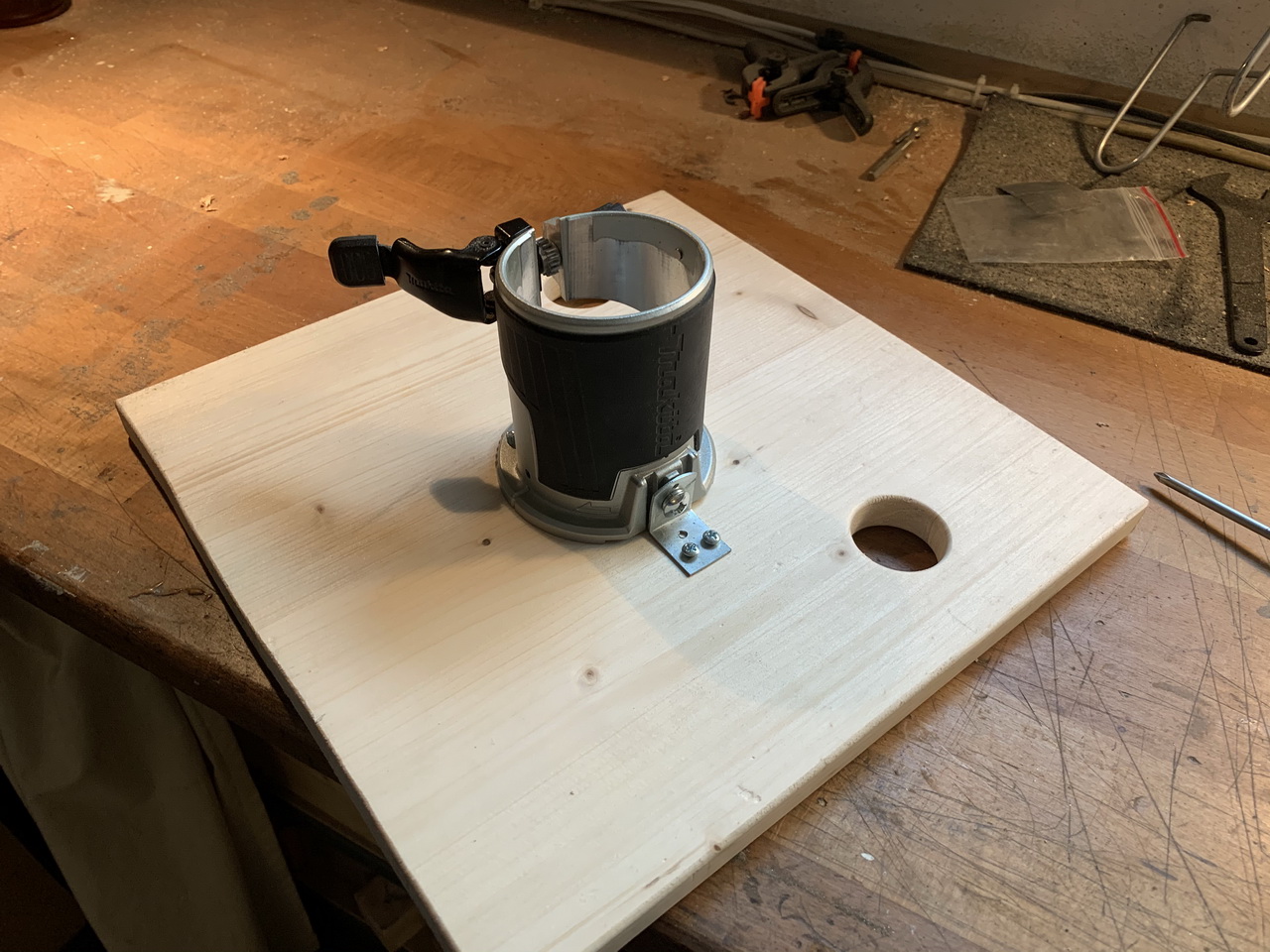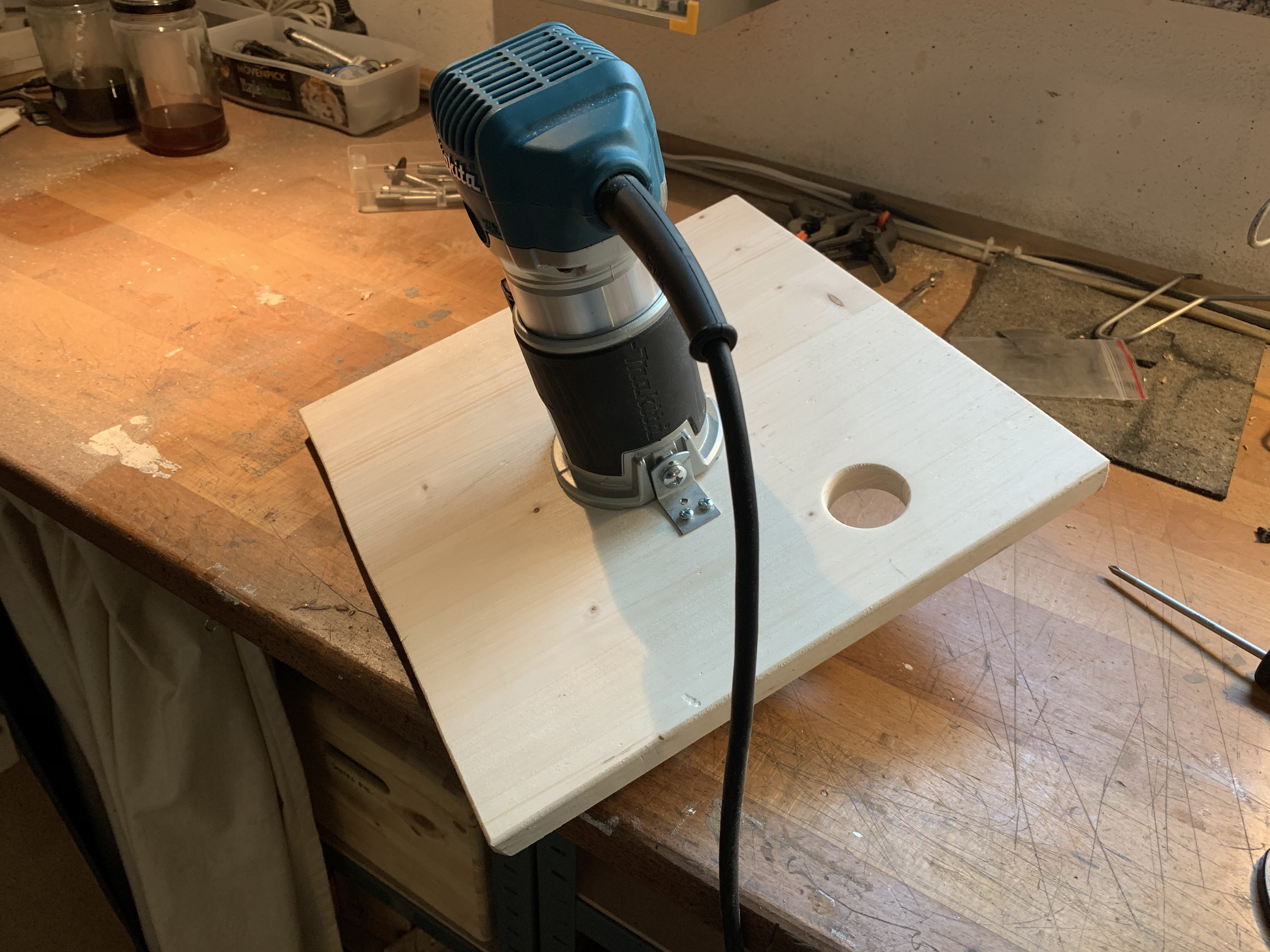 Problem is, most routers come with dual switches as a safety feature: You have to push two buttons simultaneously in order for it to turn on wich makes it awkward to install under a table. Not so my trusty Makita RT0700CX2J! It’s got a single switch and it’s a sturdy, reliable workhorse for me. The table design is as simple as it can be, with no stopbar or dust collection, and it’s only intended for use with small parts