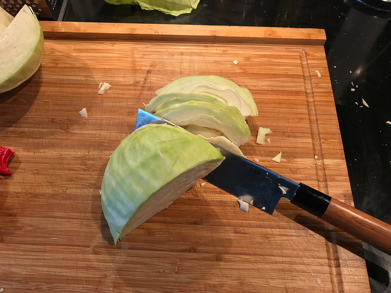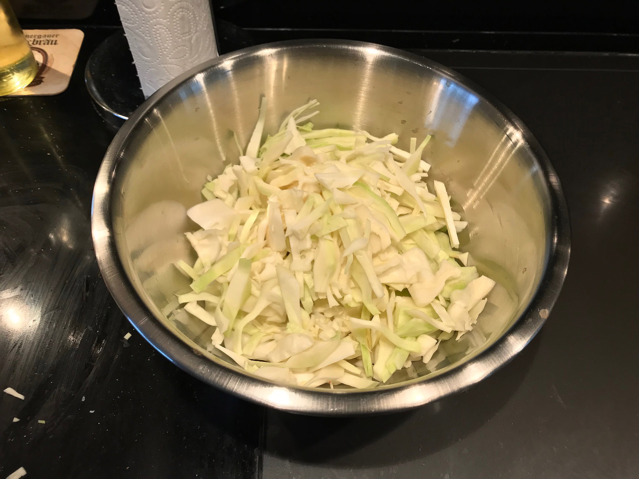 Remove the stem from the cabbage and shred it finely. The finer you chop it, the better. Mix all your ingredients and the cabbage in a large bowl (you will make a mess!) and knead gently. Then let sit for about 30-40 minutes to let some liquid build up at the bottom of the bowl.