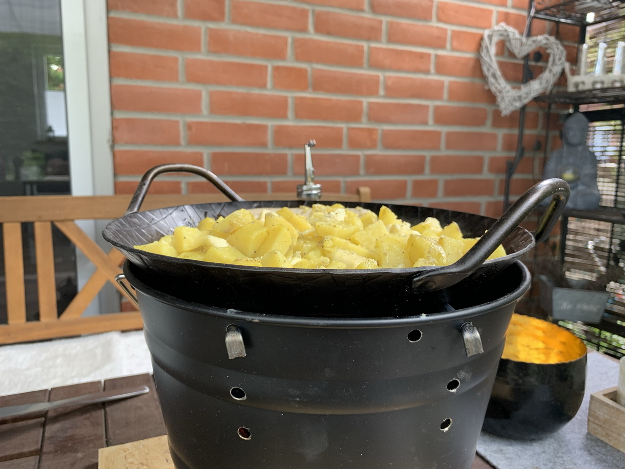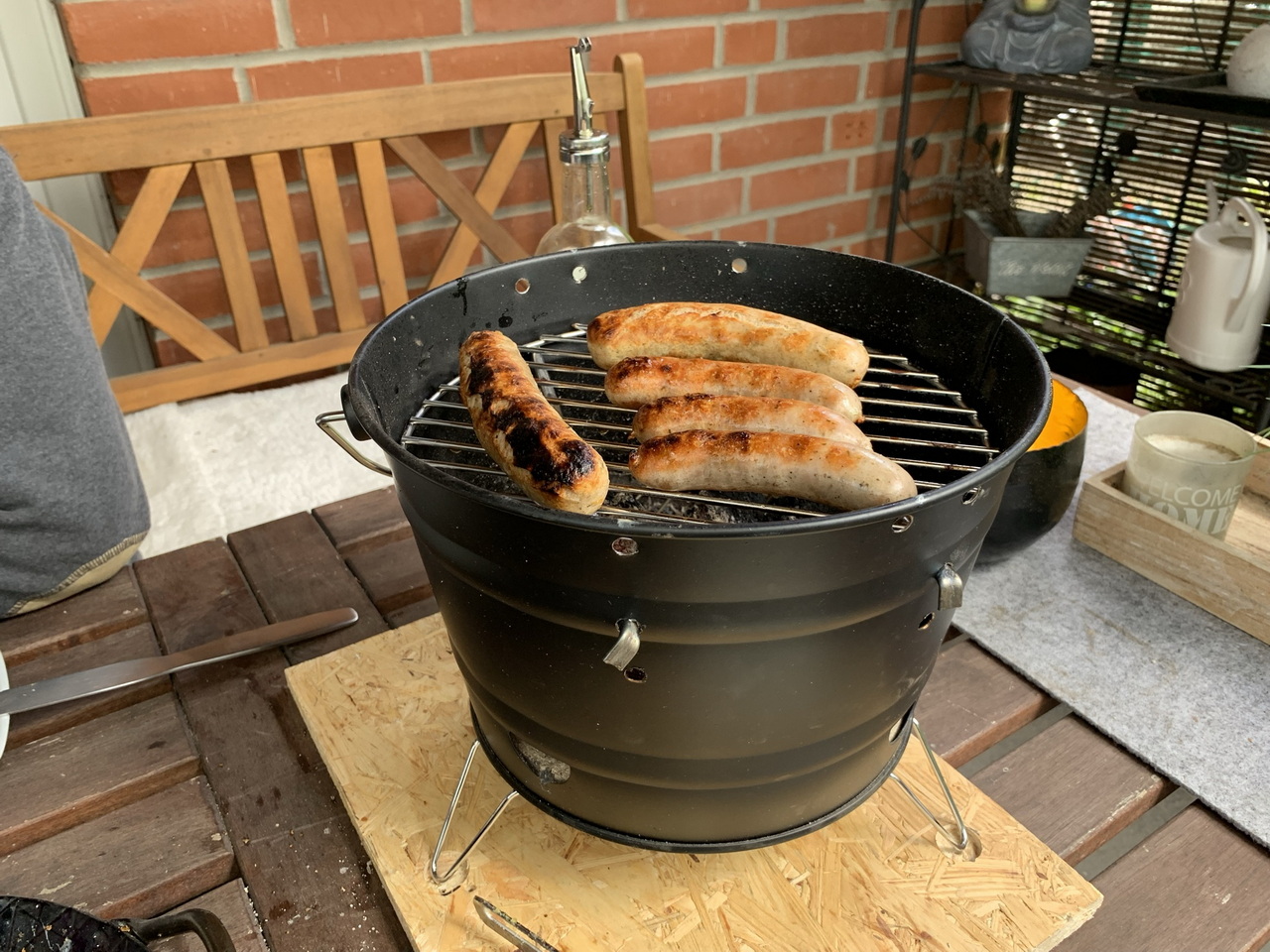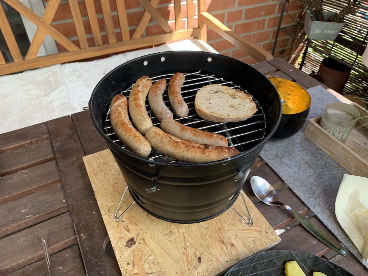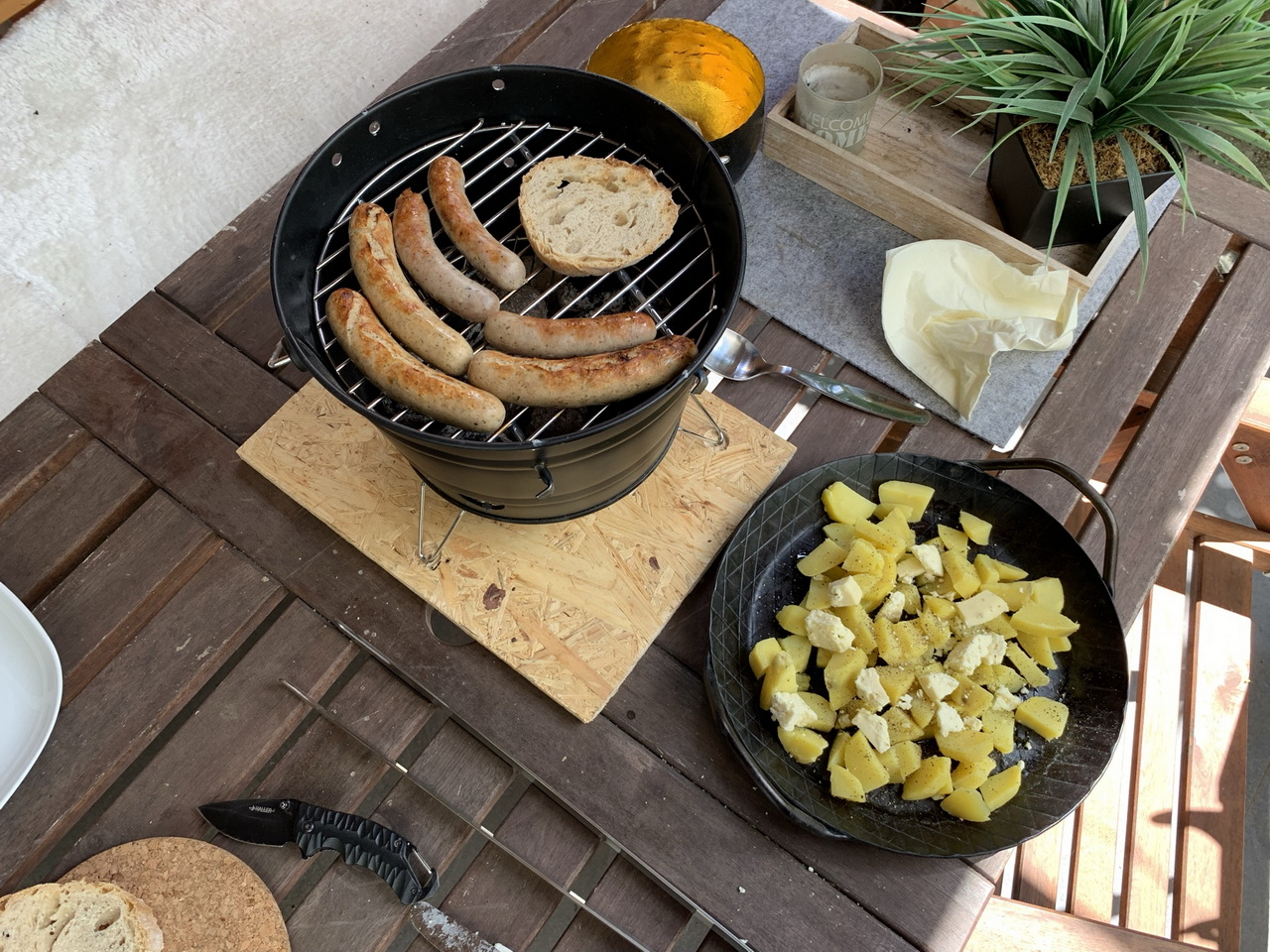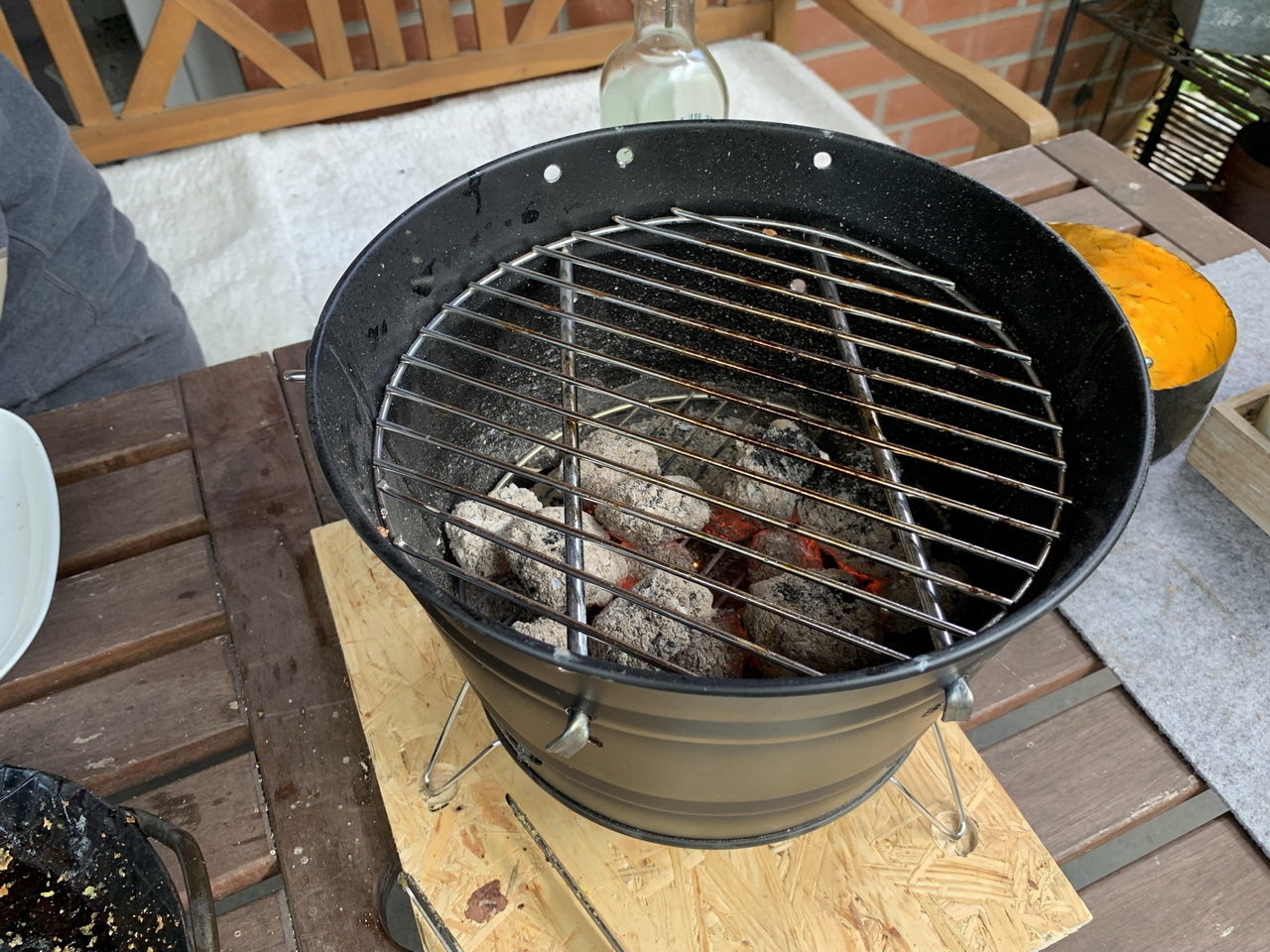 So we caught the weekly allowance of two hours of sunshine the german weather gave us today and used it to finally try out the tabletop grill. It works well and the insulation at the bottom is very effective – no particularly strong downward heat development, so it seems to be safe to use right at the table. Fotos: