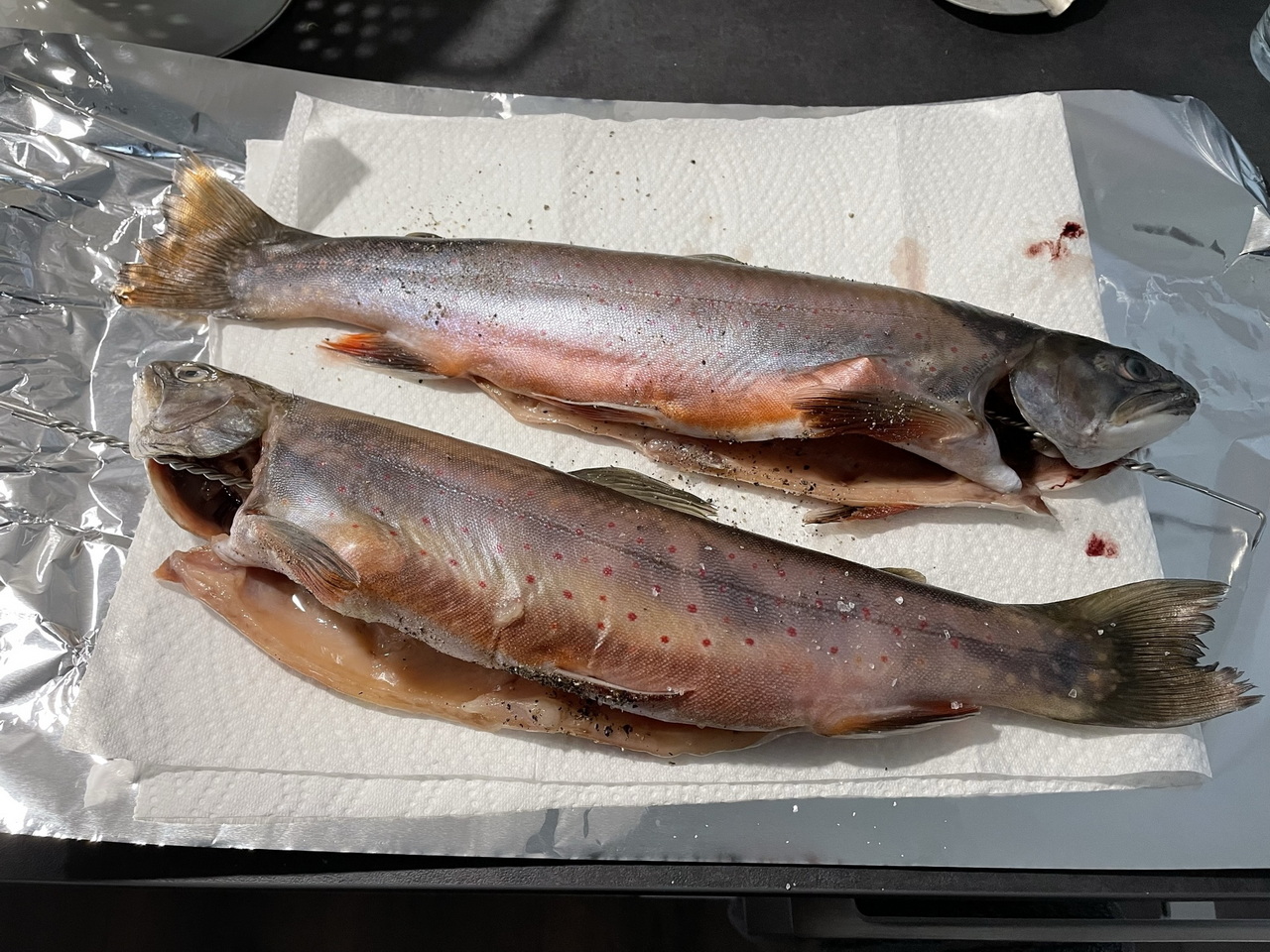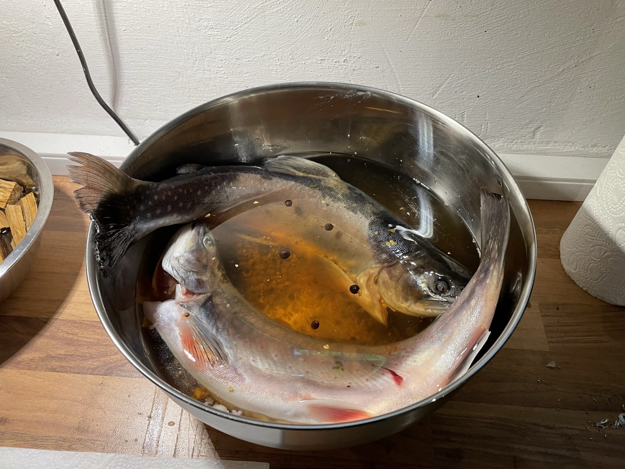 We got two beautiful chars from our favourite fishmonger and brined (see below) them over night. Then they were “hot smoked” – a fast and delicious cooking method, but not suitable for long-term preservation.