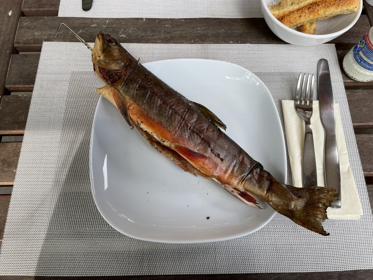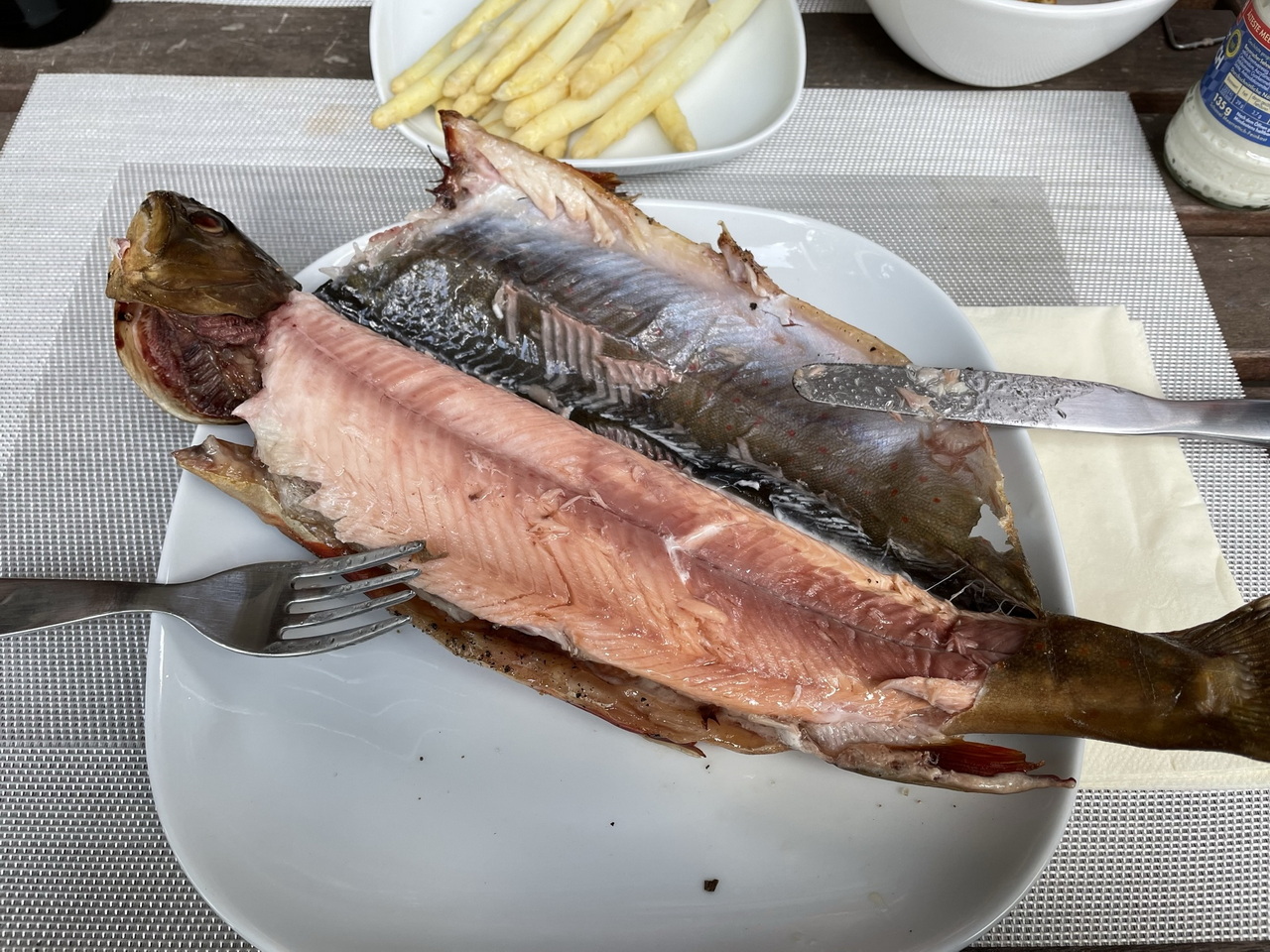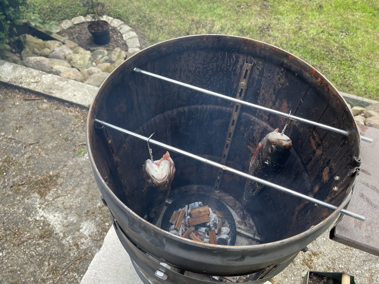 Hot smoke for about 30++ minutes (depending on the size of your fish) at up to 90°C/195 °F and until golden on the outside. Add your favourite smoking wood after 10 minutes for a nice aroma. They’re done when you can pull out the back fin very easily and can be served for example with toasted bread, salad and horseradish. They’ll keep in the fridge for max. 2-3 days.