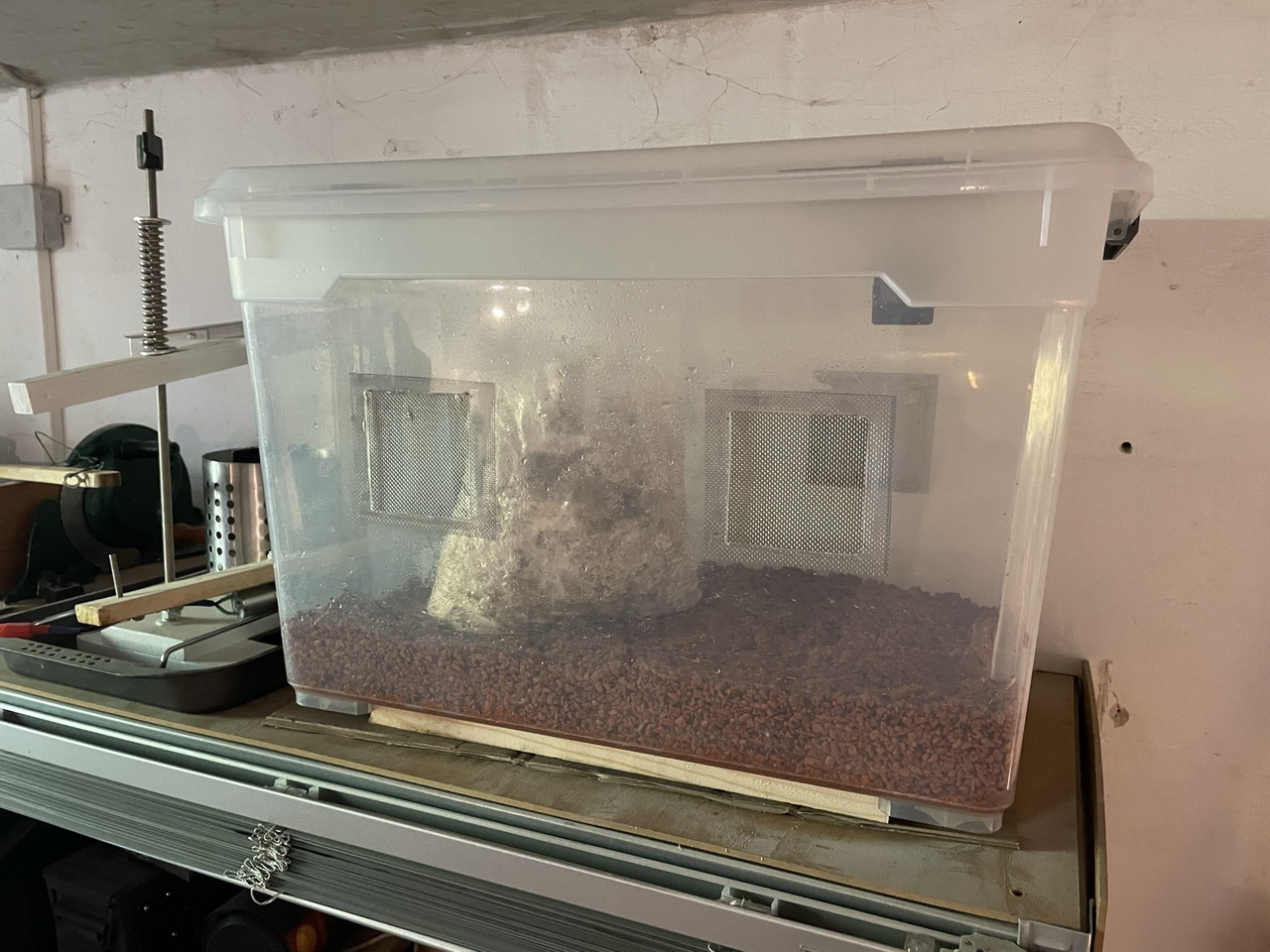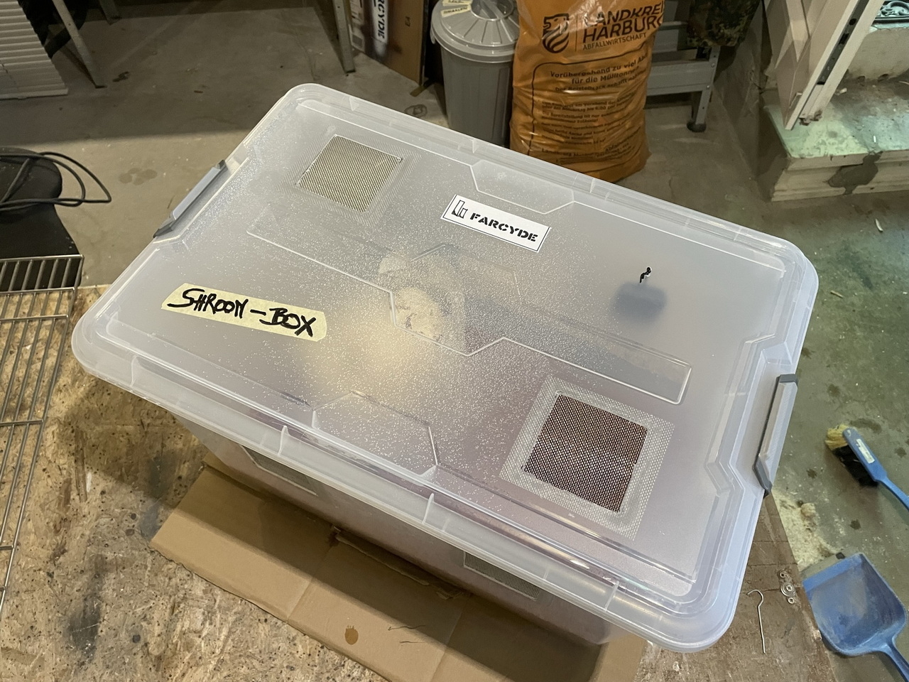 In order to assist my mushroom bags a little in growing I made this so-called “Shotgun Fruiting Chamber” that I stumbled upon here. It’s an easy concept, but afaics it makes perfect sense so I’m going to try it.
