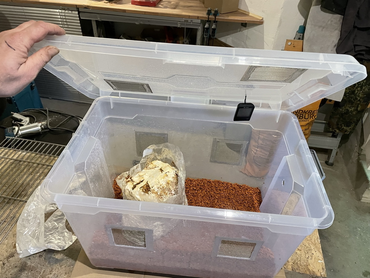 It’s a container to a.) keep humidity high, b.) allow for airflow and c.) let some light in – the three things mushrooms like to have when fruiting. The method (and the quirky name) is well explained under the above link and I don’t think my adaptations will do any harm. I had the main items still on hand in the basement and just had to buy some planting granulate (perlite wasn’t available).