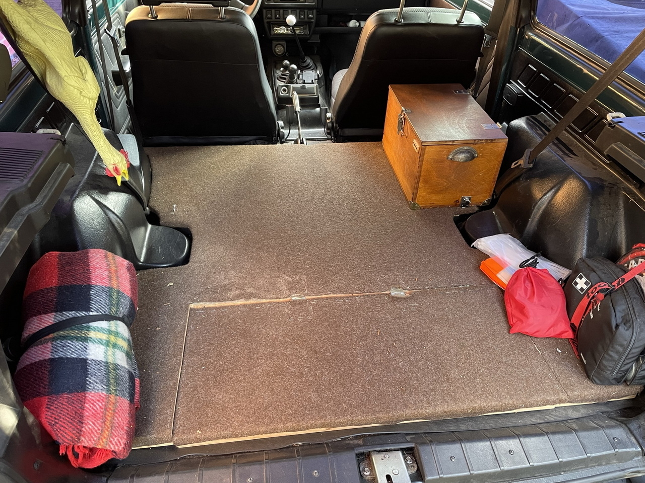 I removed it’s backset and instead fit in a base plate in the rear for more clearance, but honestly it still doesn’t offer a lot of space. I tried it: If you fold over the passenger seat, you can sleep in there but it’s certainly not a comfortable five-star-hotel-bed. Nonetheless: It’s absolutely sufficient for spending a lonley night at the lake, fishing. A sleeping bag and a mat will always fit in besides my equipment and so, concerning the very limited space on offer and the very occasional action it will see, I designed my ultra minimalistic Juri Chuck Box!