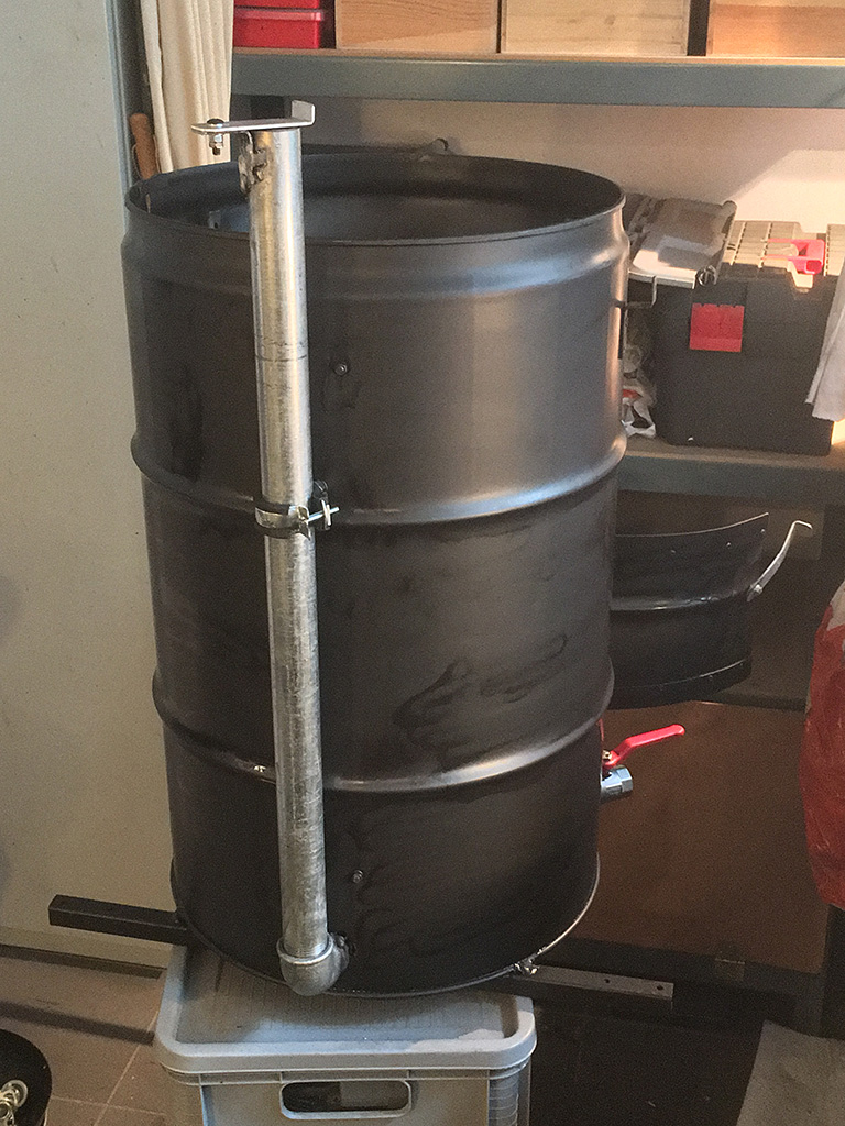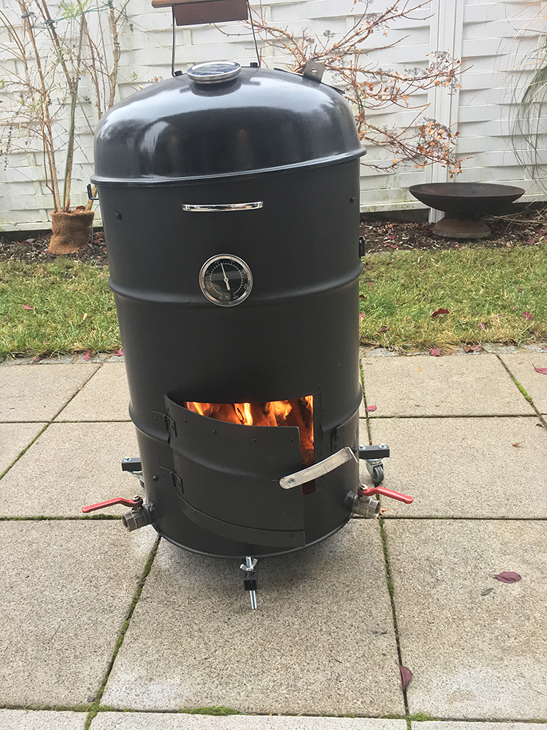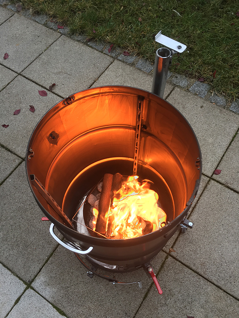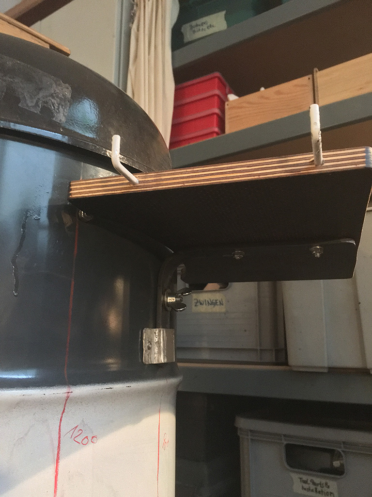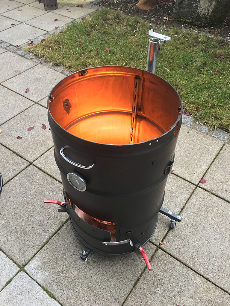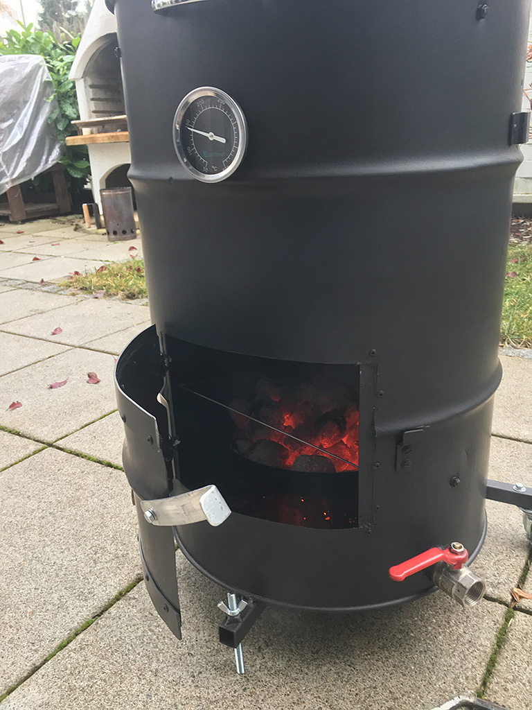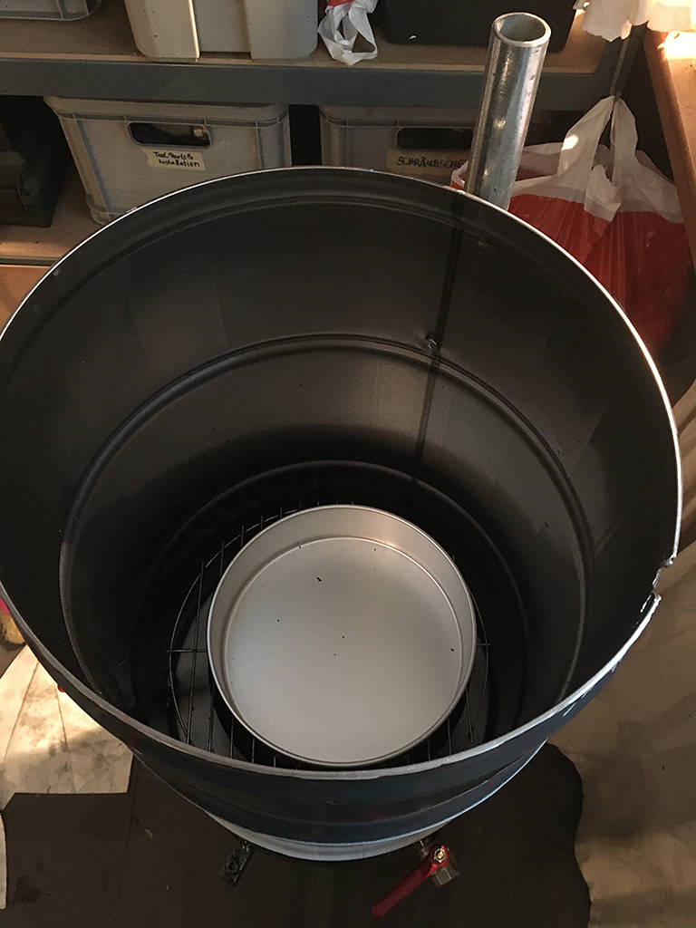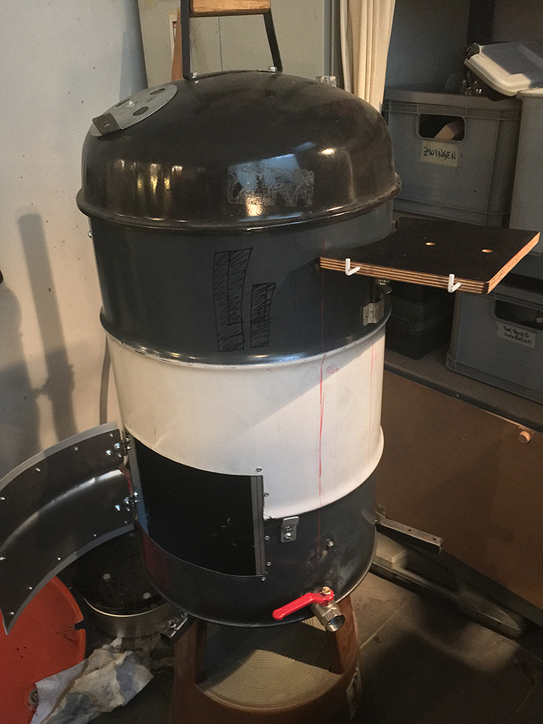 3rd day of making the new UDS: Added a small, removable shelf (for thermometers) with hooks and a moveable lid for the main Air intake. I also finished the firehole door and a drain-hole for when it might get flooded (again). It’s also got it’s first layer of fire-proof laquer. After that, it got de-oiled with a felt litre of Acetone.