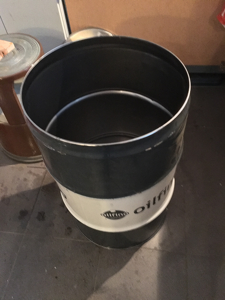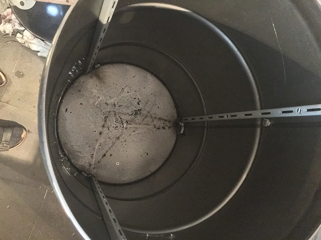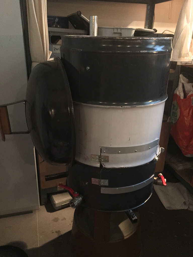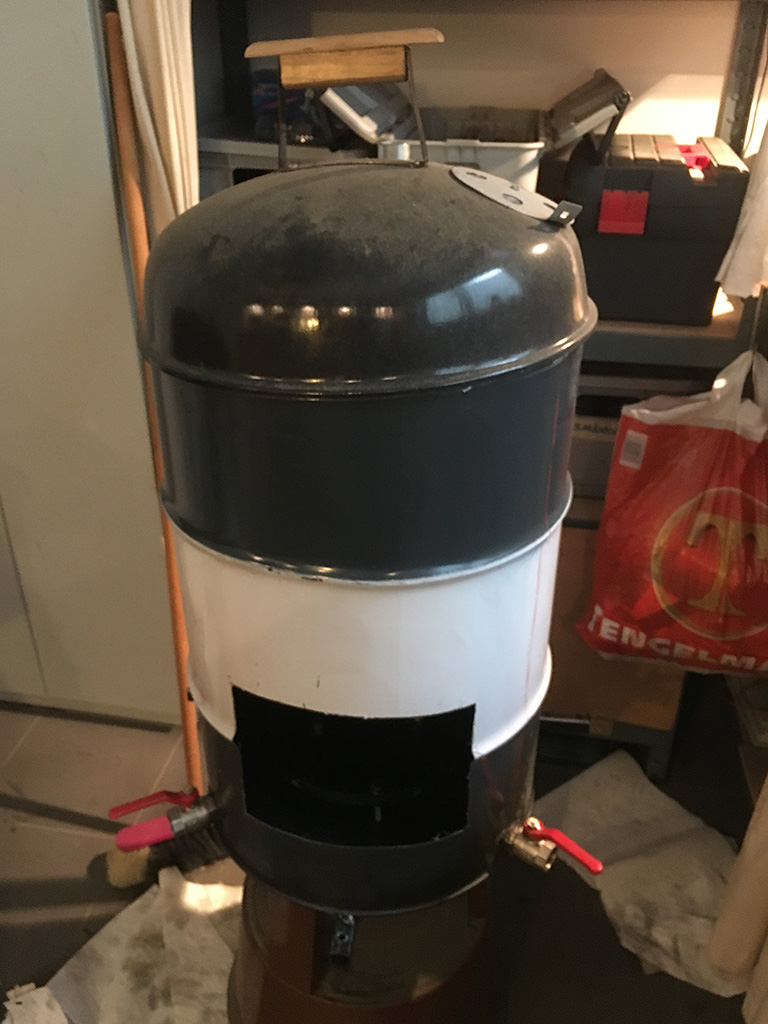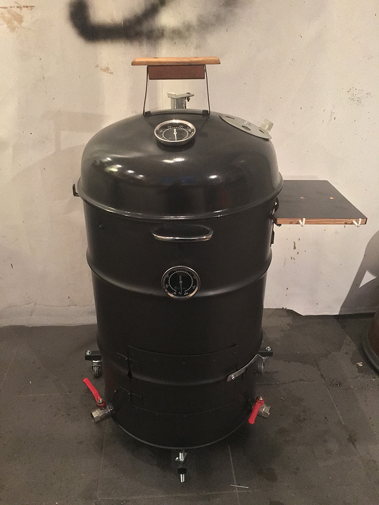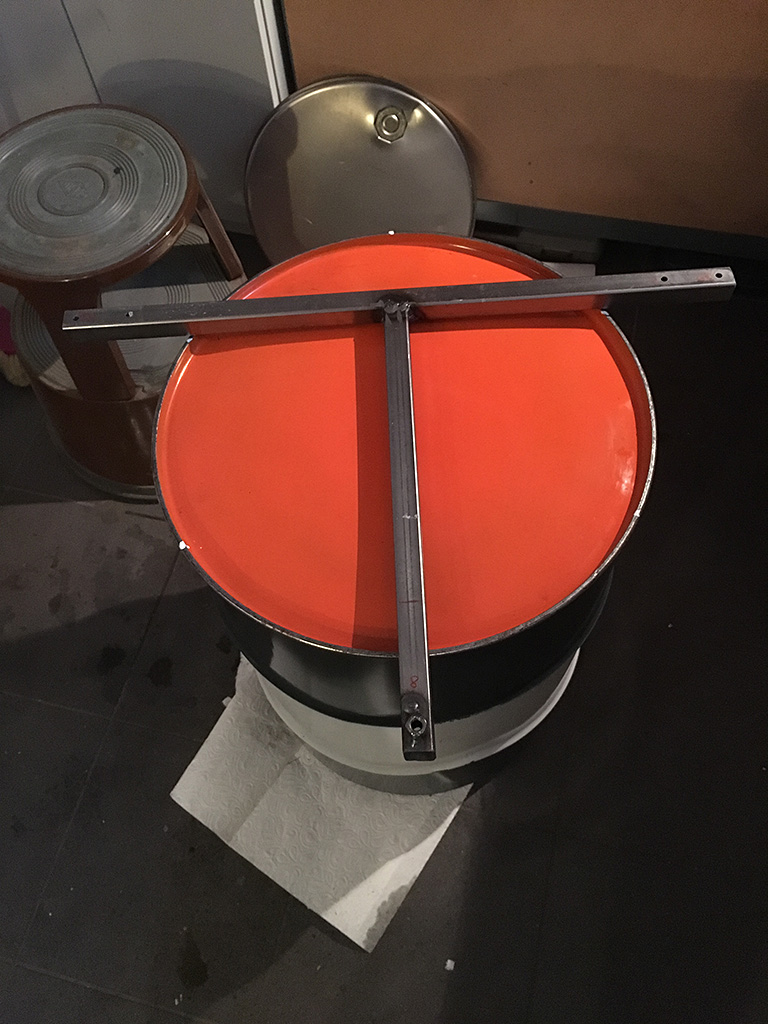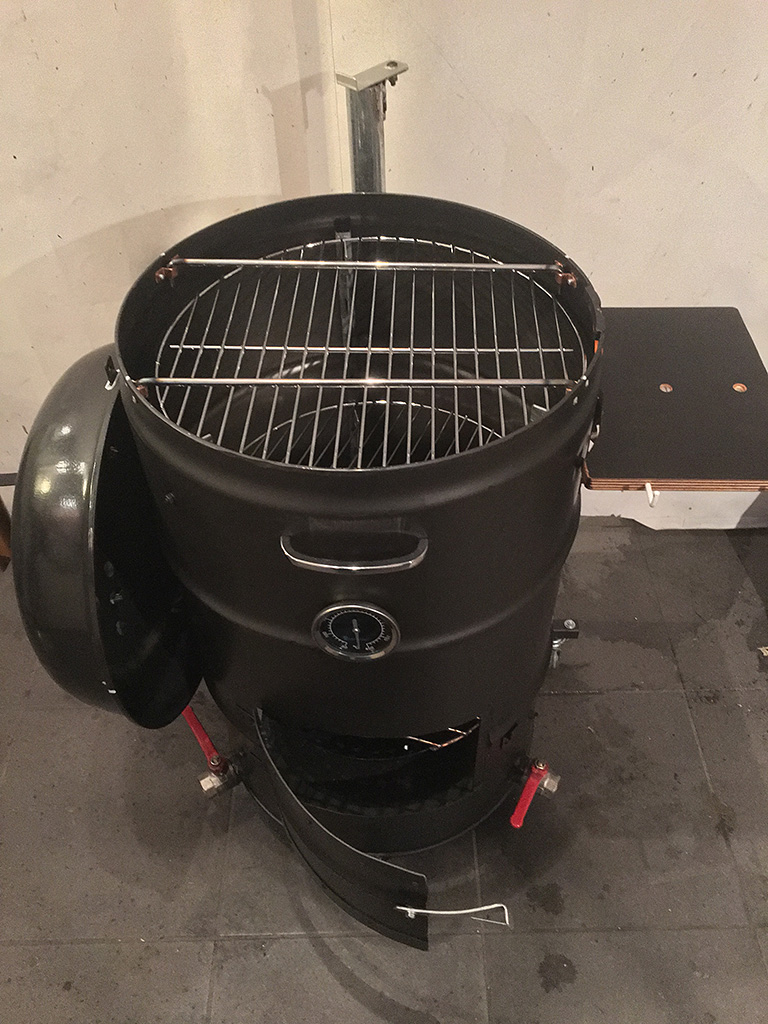 3rd day of making the new UDS: Added a small, removable shelf (for thermometers) with hooks and a moveable lid for the main Air intake. I also finished the firehole door and a drain-hole for when it might get flooded (again). It’s also got it’s first layer of fire-proof laquer. After that, it got de-oiled with a felt litre of Acetone.