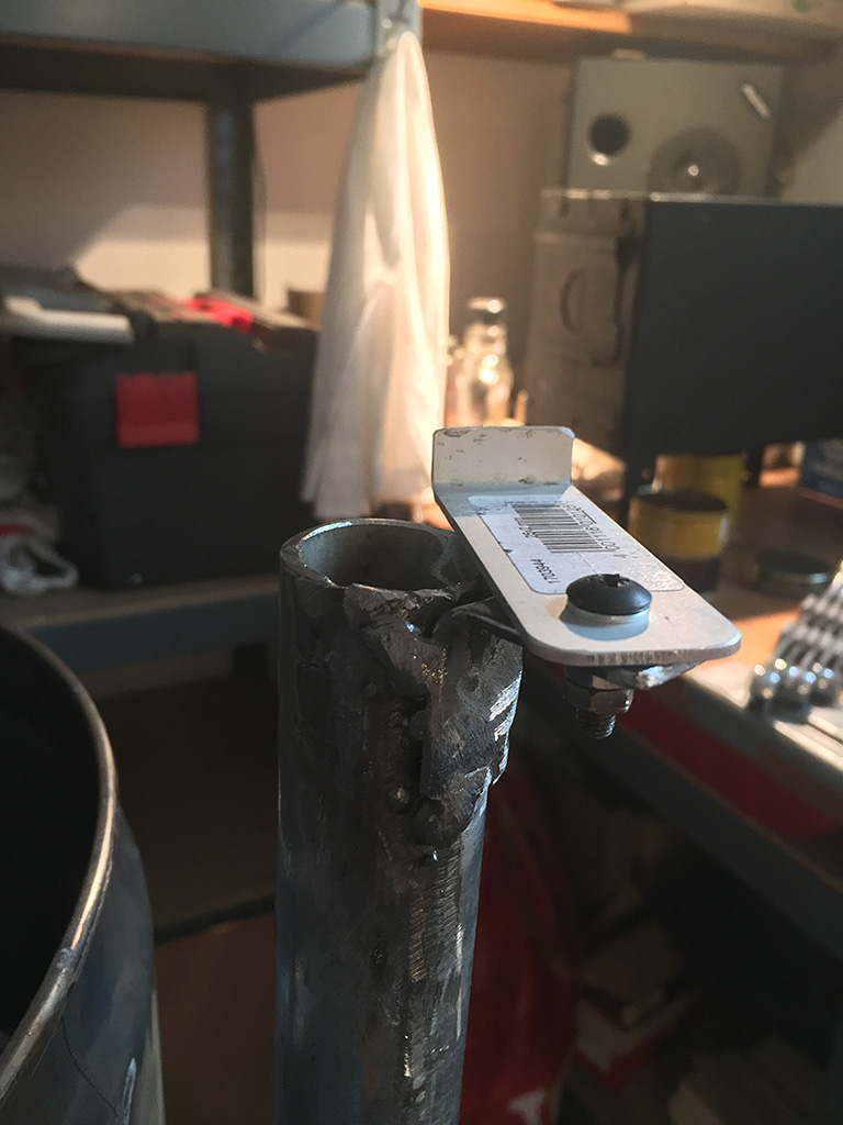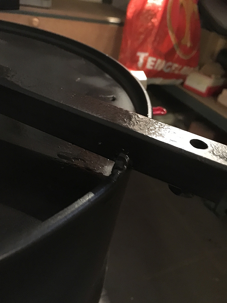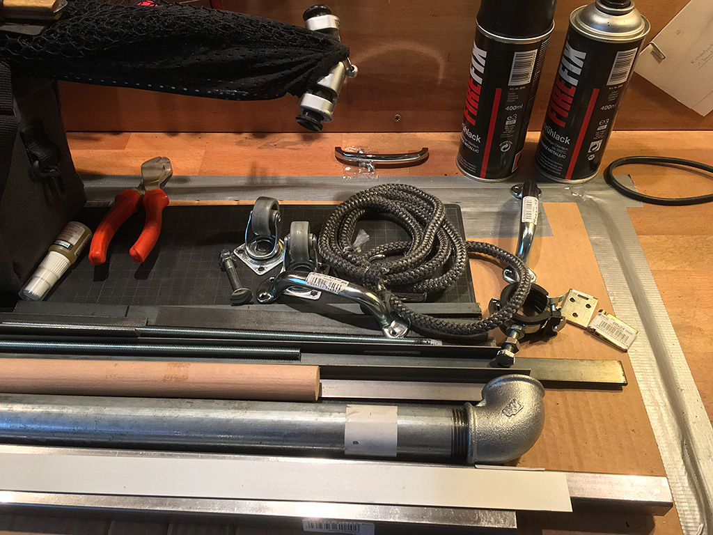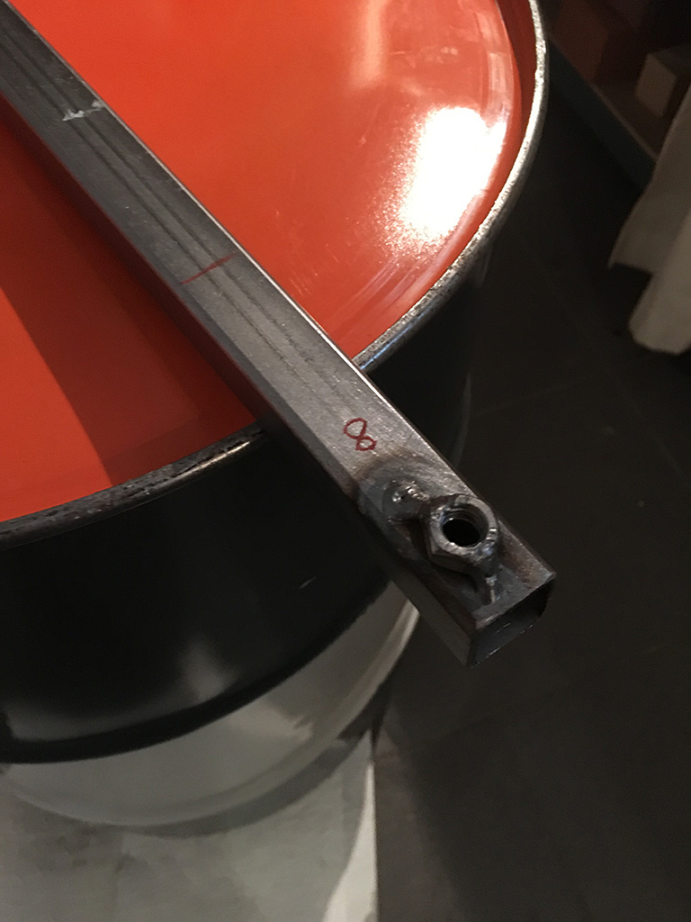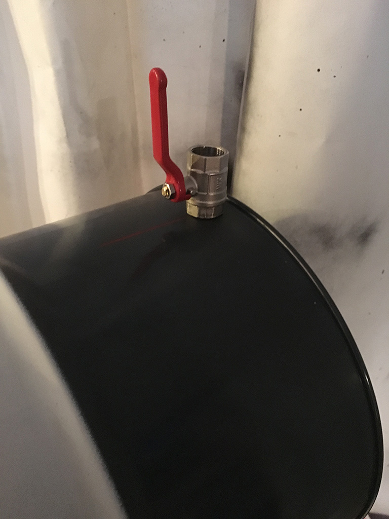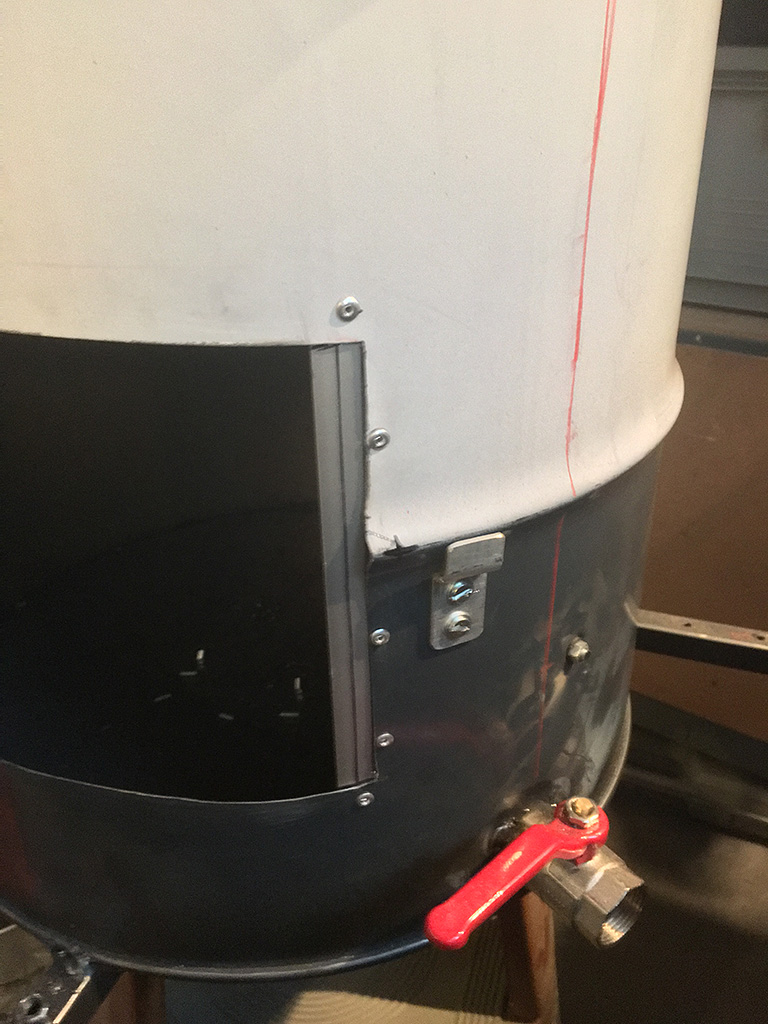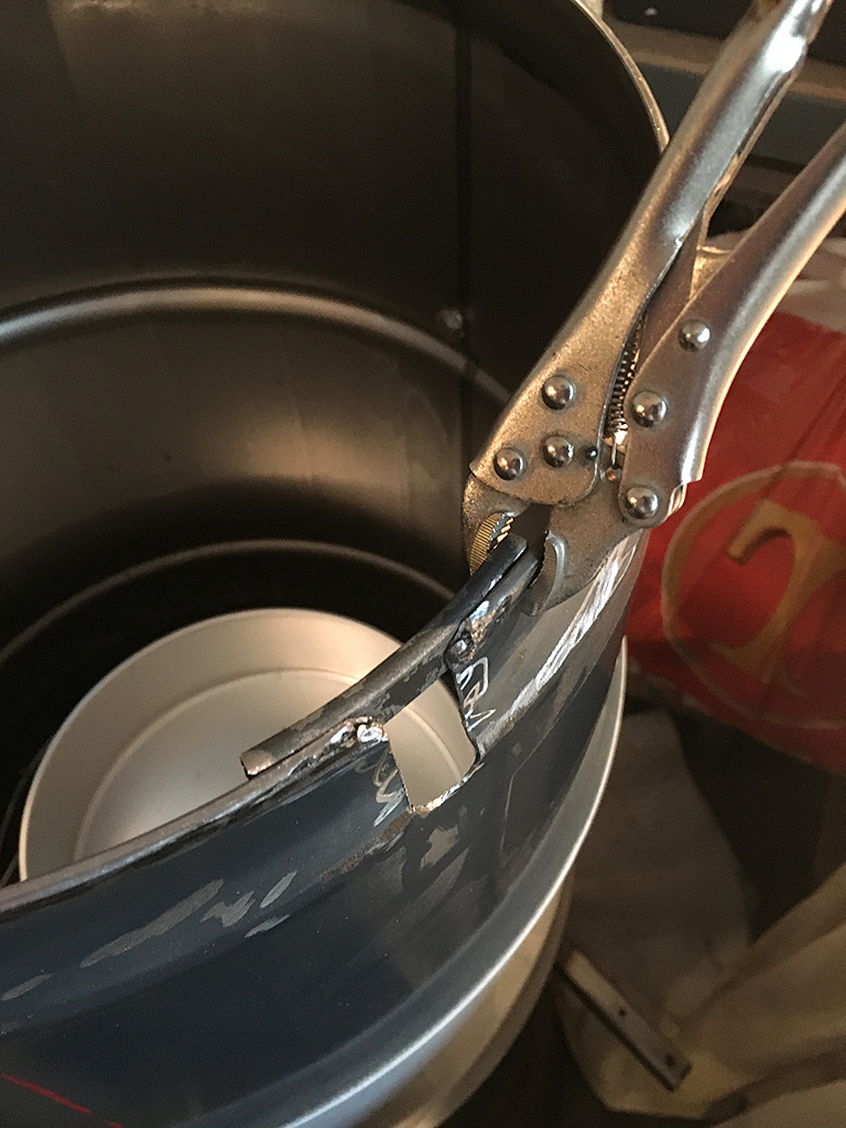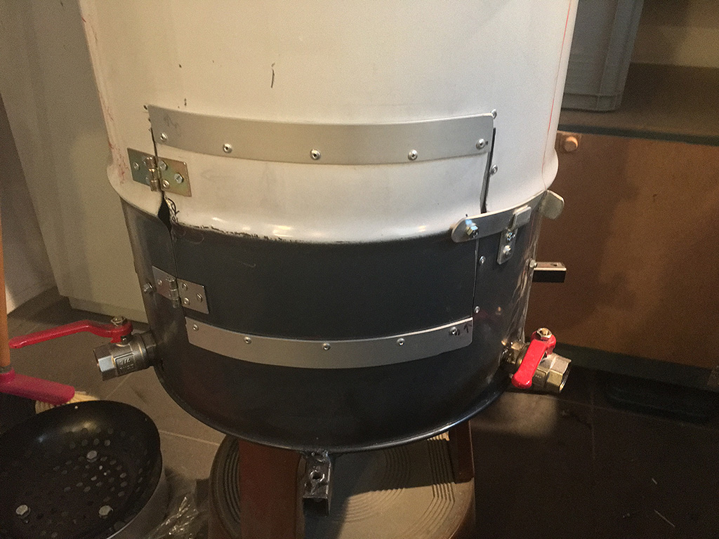 3rd day of making the new UDS: Added a small, removable shelf (for thermometers) with hooks and a moveable lid for the main Air intake. I also finished the firehole door and a drain-hole for when it might get flooded (again). It’s also got it’s first layer of fire-proof laquer. After that, it got de-oiled with a felt litre of Acetone.