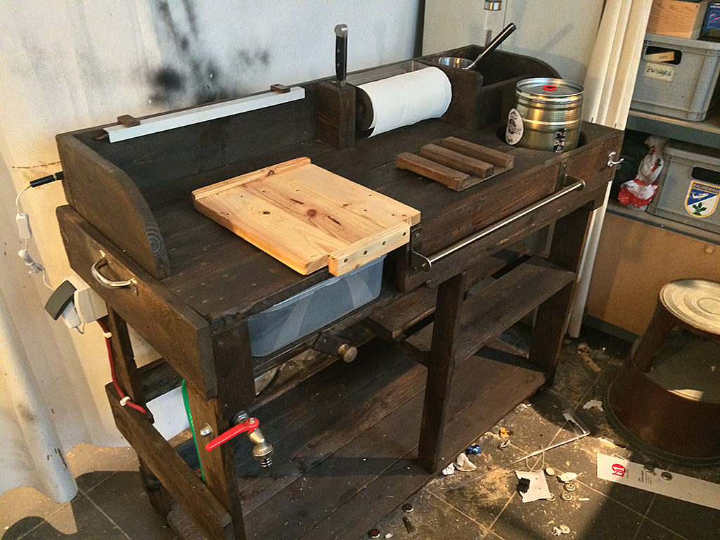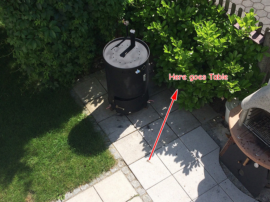 This is my Grilling Table that I want to place beside my Barbecue-Grill and Smoker. It is made solely from the Wood of two Euro-Pallets, and it was fairly easy to plan and build until now. Now comes the really difficult part of somehow heaving it out of my basement shop up to the garden… Update will follow shortly – hopefully.