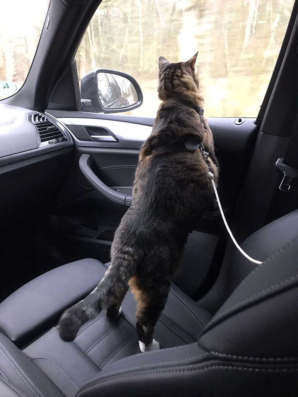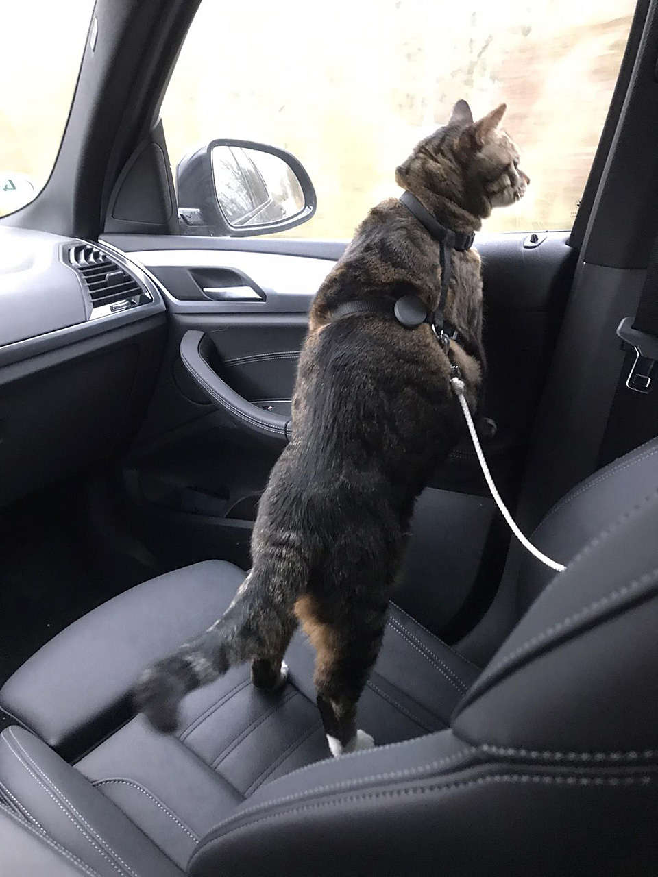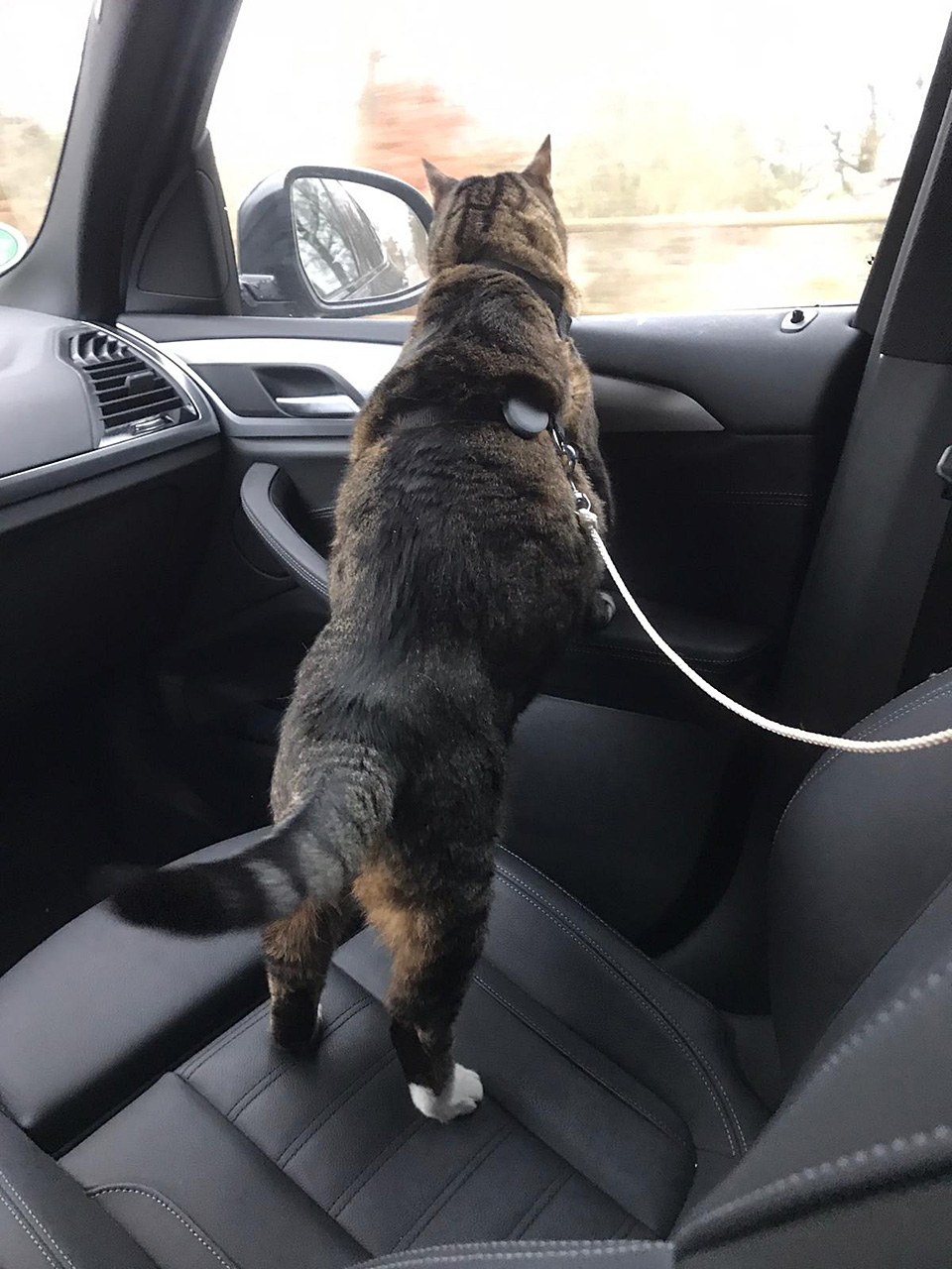 So we had a 10 minute countryside drive to my sister in law’s house today… 🙂 Gattina is generally very relaxed when she’s in the car, but this time she wasn’t “trapped” in her transport basket but could wander about almost freely. She was so curious and excited by all the fascinating sights from the window!