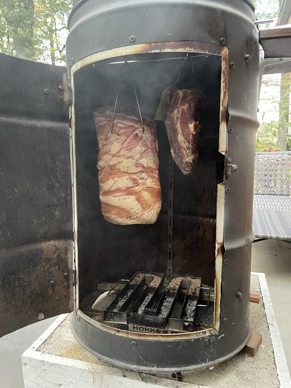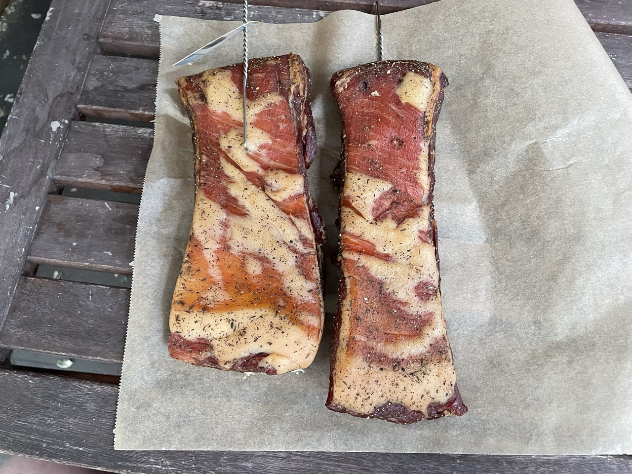 I finally had the time again to make some cured and/or smoked meat again! I’m glad! Four pieces of fine meat that I cured with my standard meat curing formula and each souped up little.