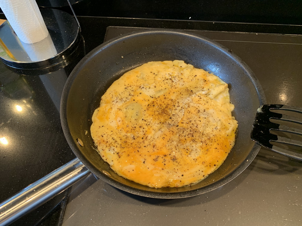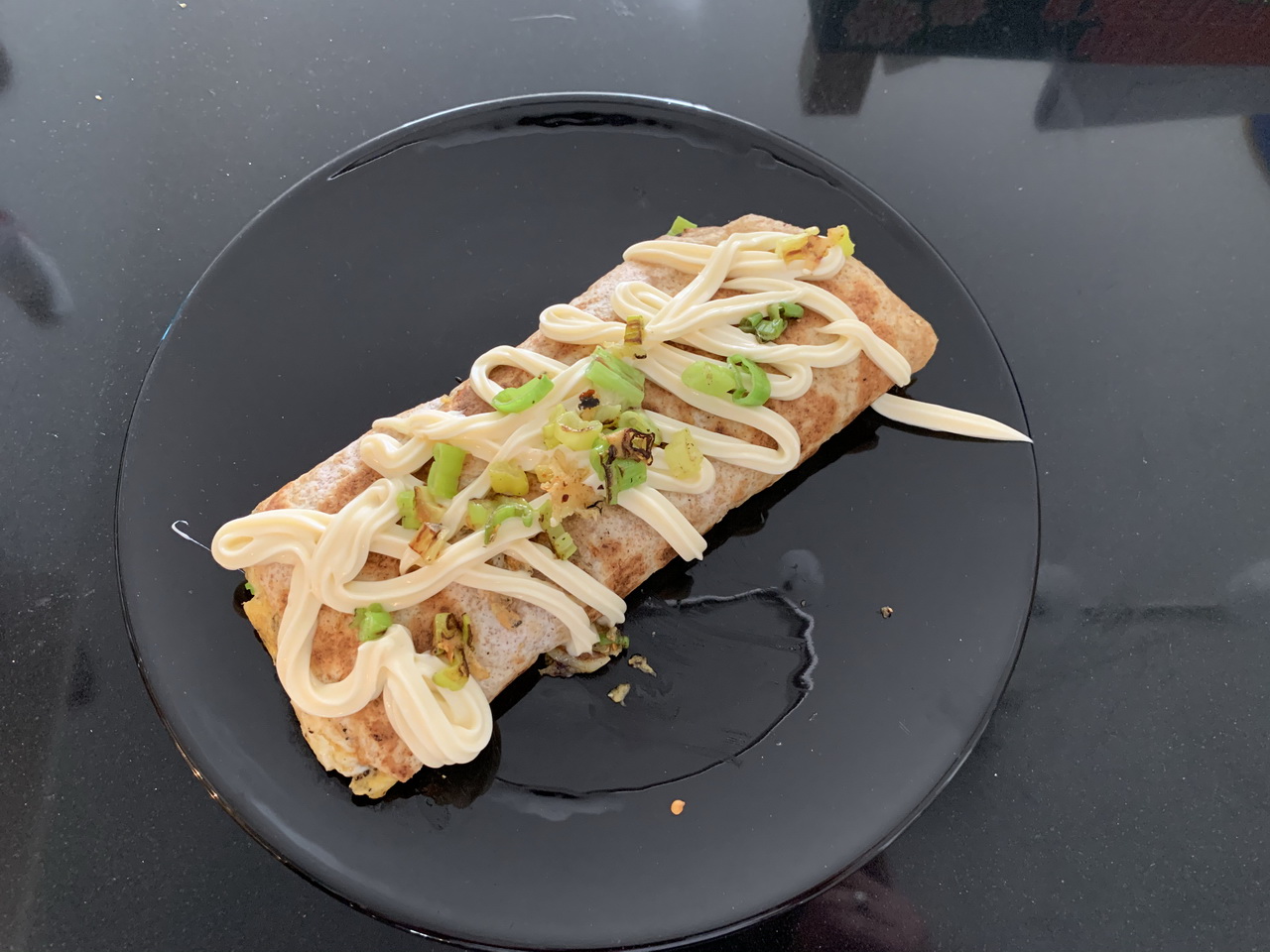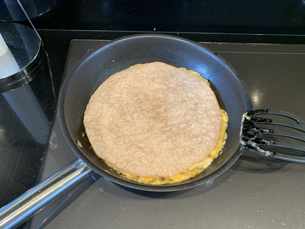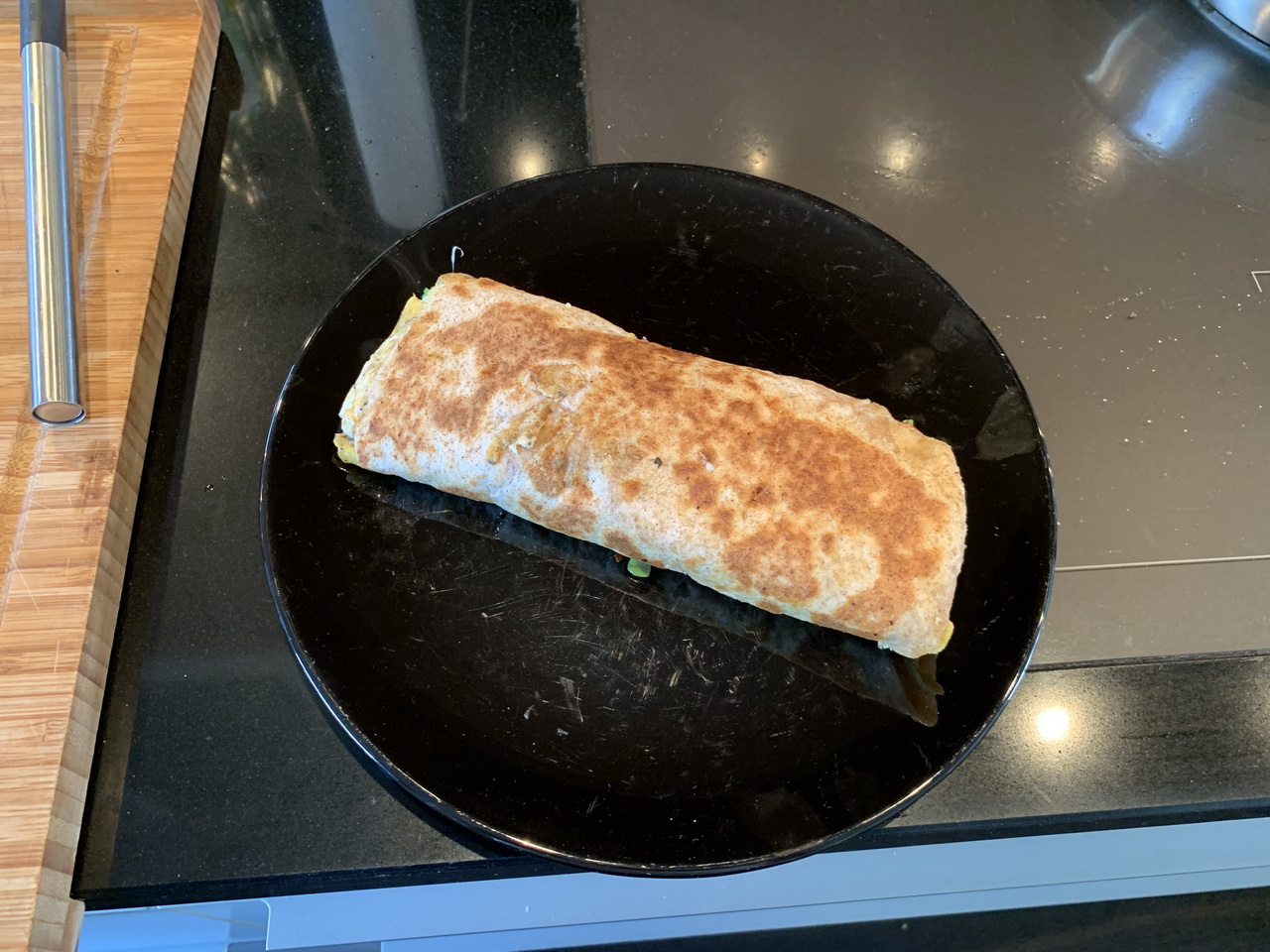 This is my sort of breakfast burrito – thrown together from what you’ve got in the fridge and melted together to cheesy, delicious goodness 🙂 Of course you can throw in whatever like but this one is mine. It’s fast and easy in the morning.