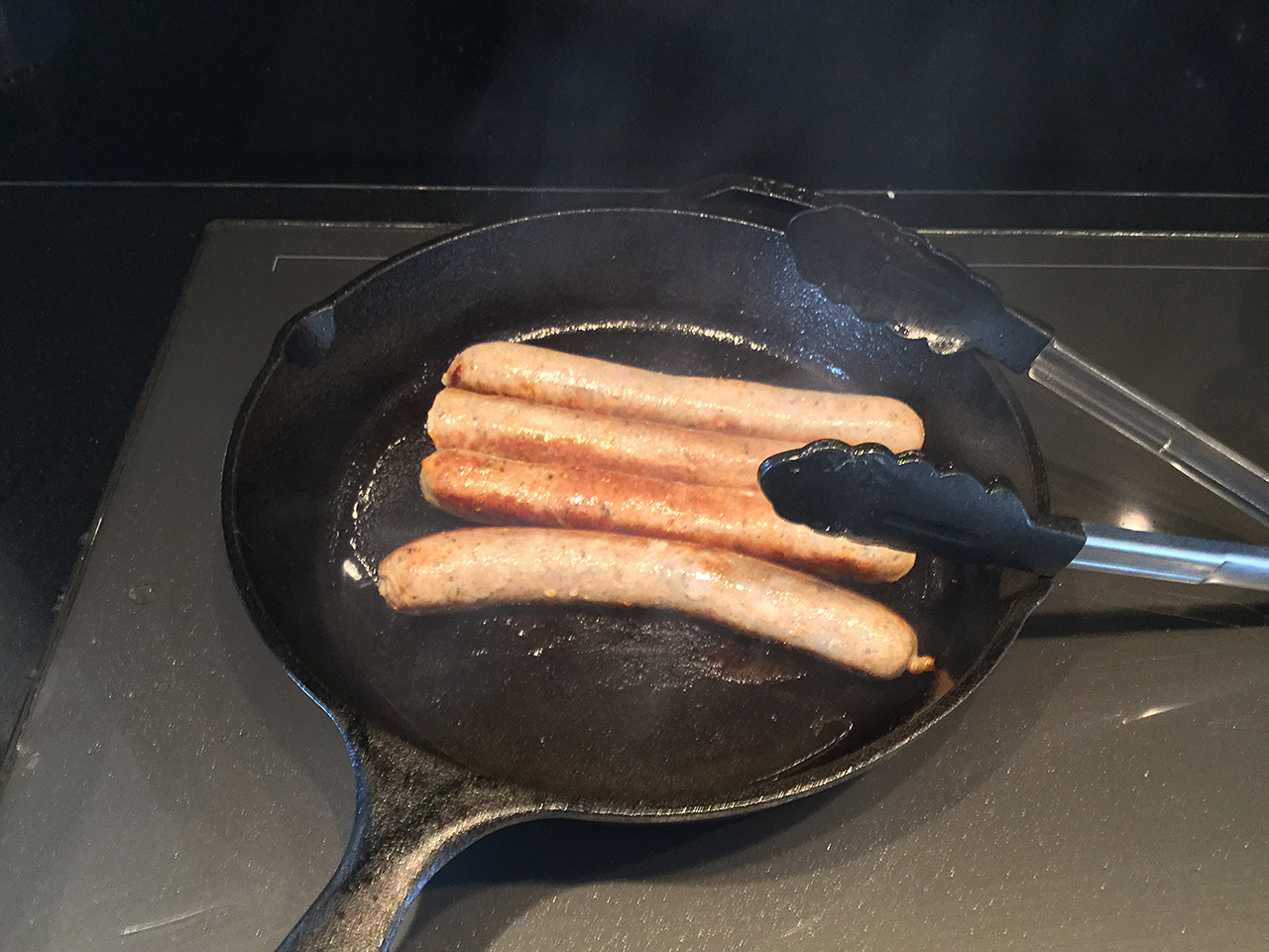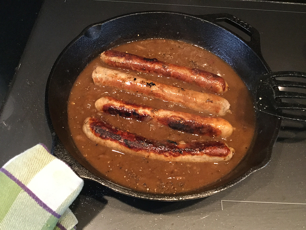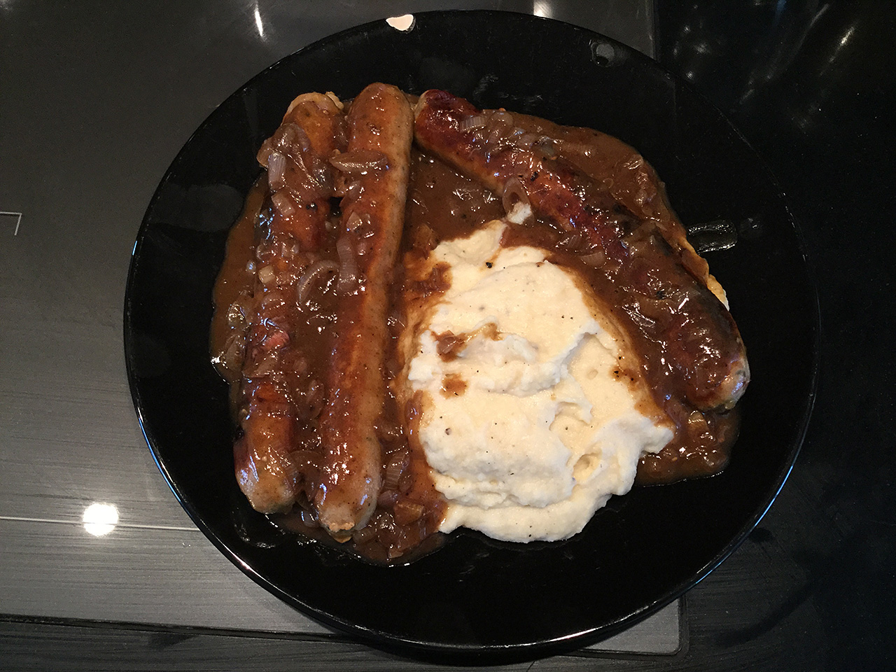 I made “Bangers and Mash” today, which is sausages and mashed potatoes with onion gravy. Veeery yummy! Here’s how: